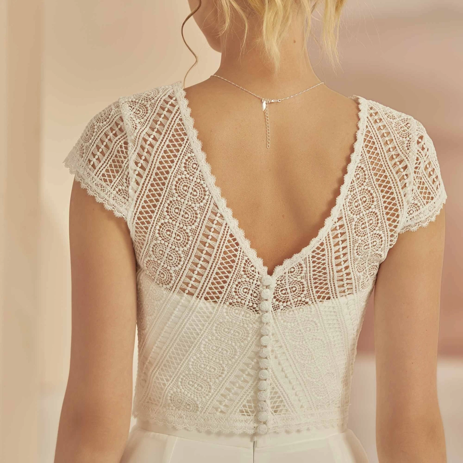 Boléro de mariée en dentelle boho, proposé avec manches courtes.