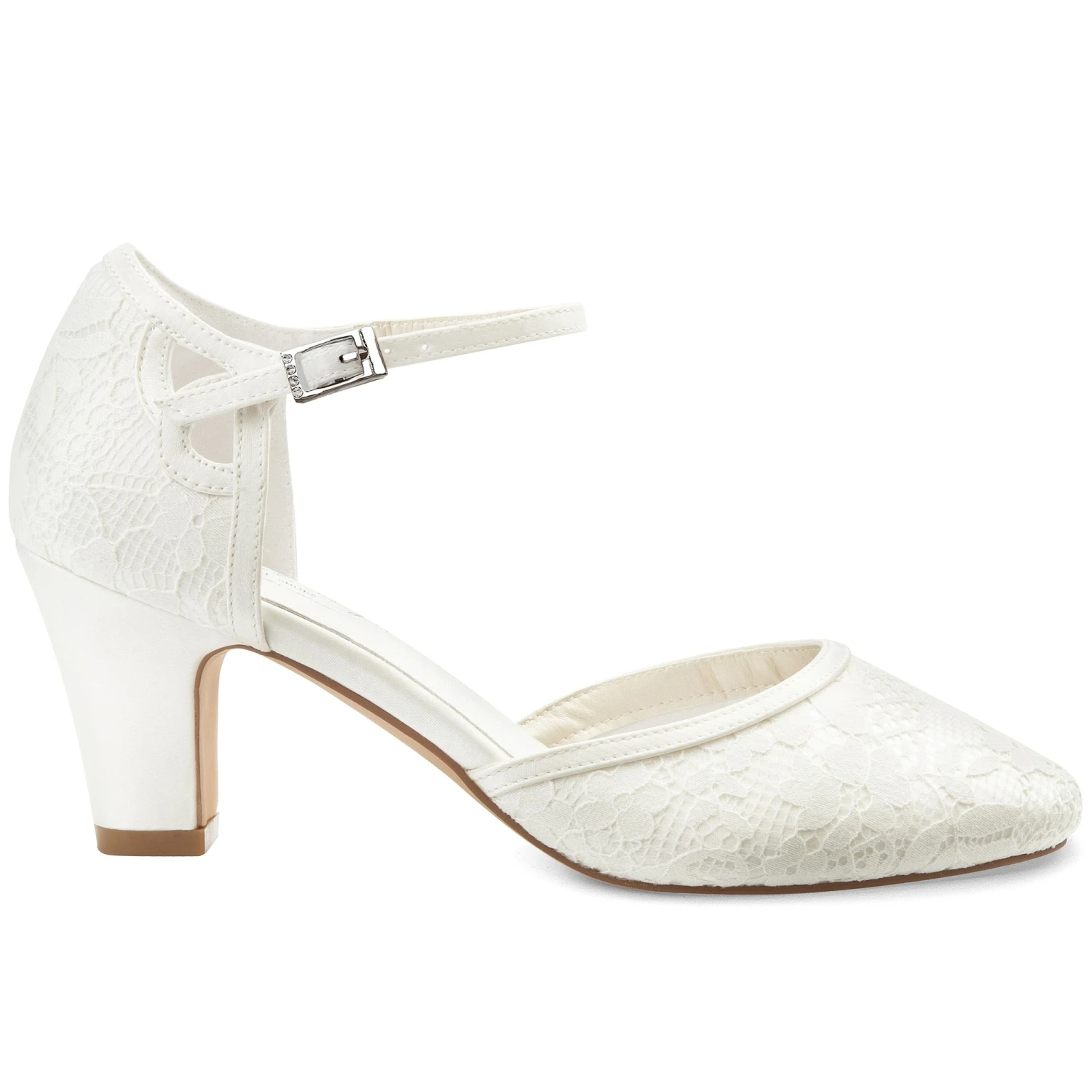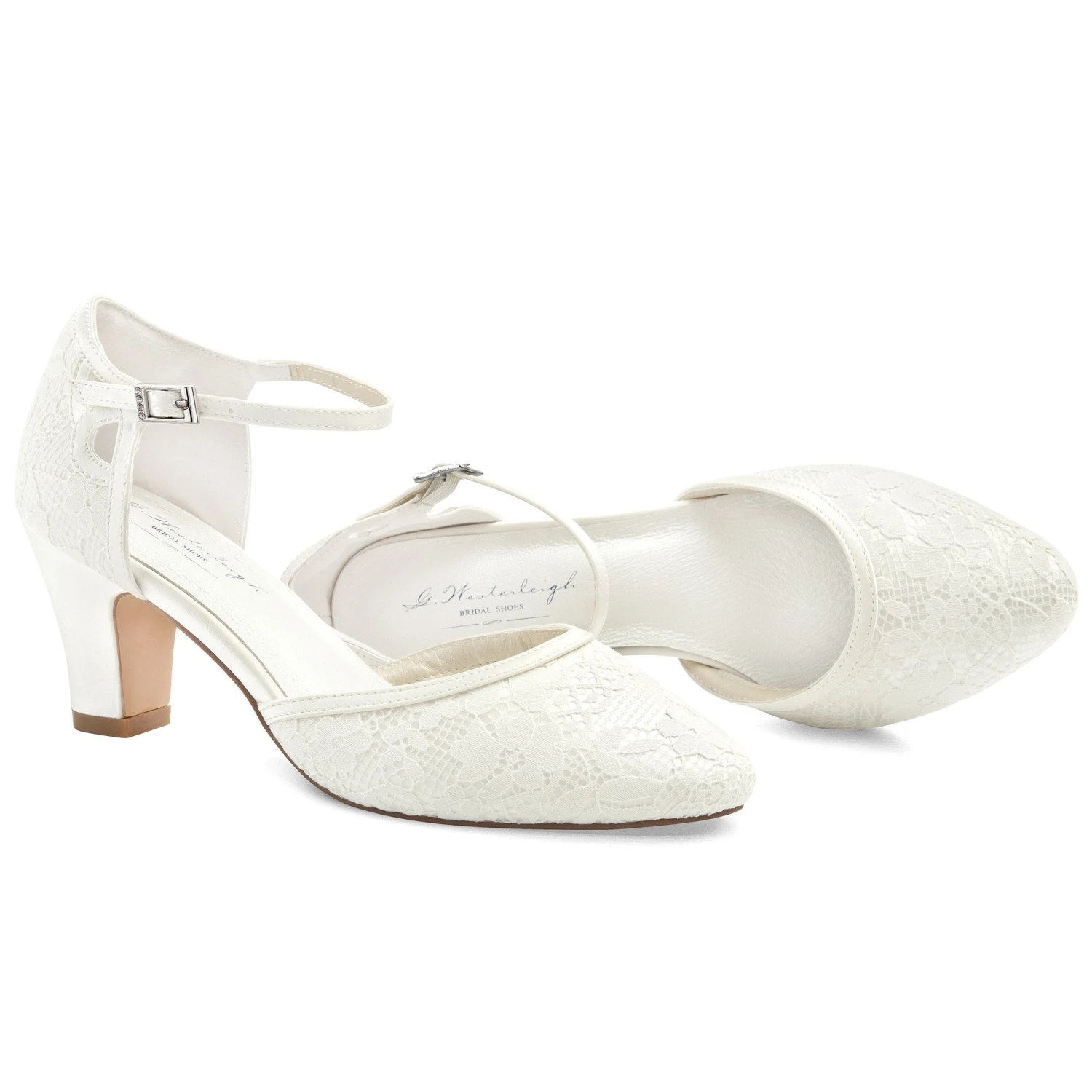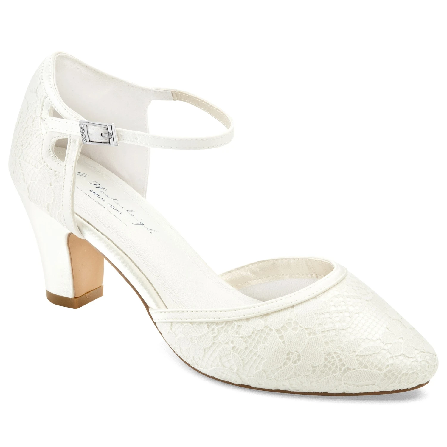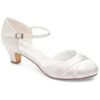 Chrissy est une chaussure de mariĂ©e classique et Ă©lĂ©gante, recouverte d’une delicate dentelle ivoire.