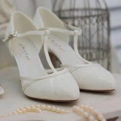 Chaussure de mariée à bout pointu. Bride remontante et bride à la cheville pour un maintien parfait du pied.