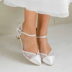 Ces chaussures de mariée sont très élégantes avec leur bout pointu, son satin et sa dentelle agrémentée de sequins.