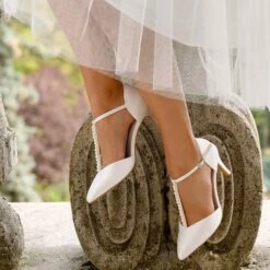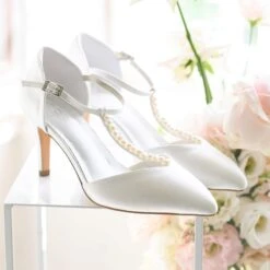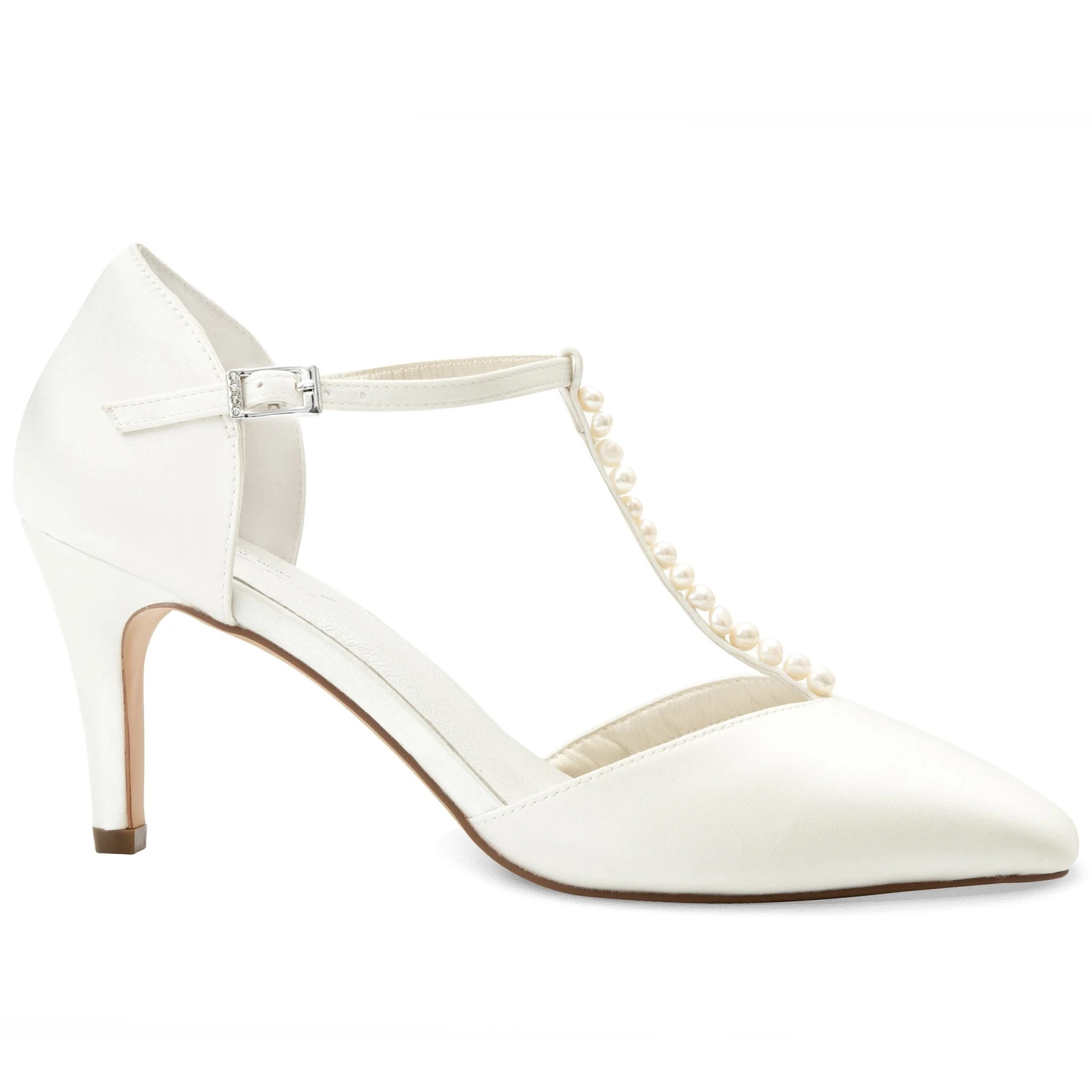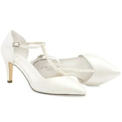 Sienna est une paire de chaussures de mariée très élégante, avec son talon haut et sa bride en T recouverte de perles d’eau douce.