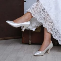 Chaussures de mariée en satin ivoire et à bout pointu.