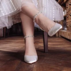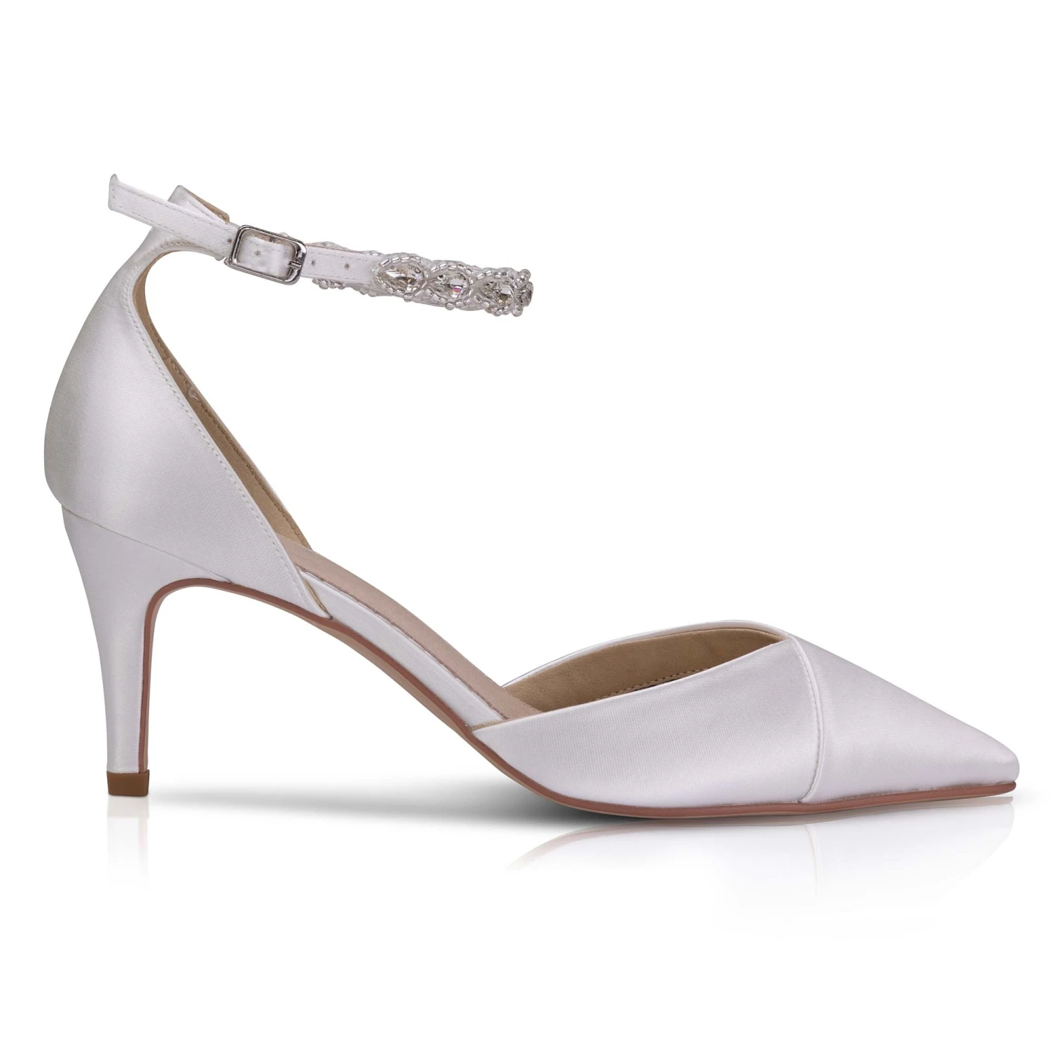 Summer est une magnifique chaussure de mariĂ©e Ă bout pointu avec un croisĂ© de satin sur l’avant de la chaussure.