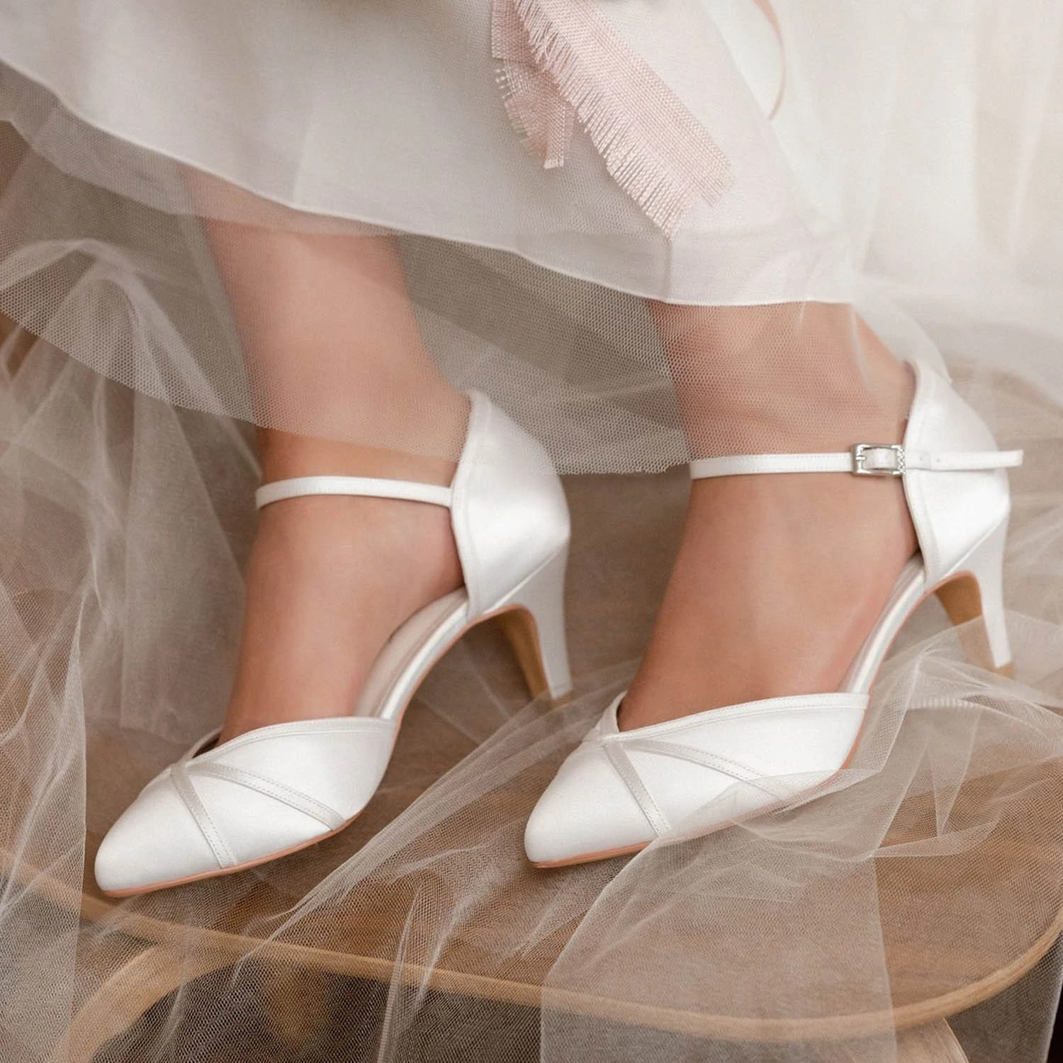 Clara est une chaussure de mariage en satin à bout pointu, fabriquée à la main.