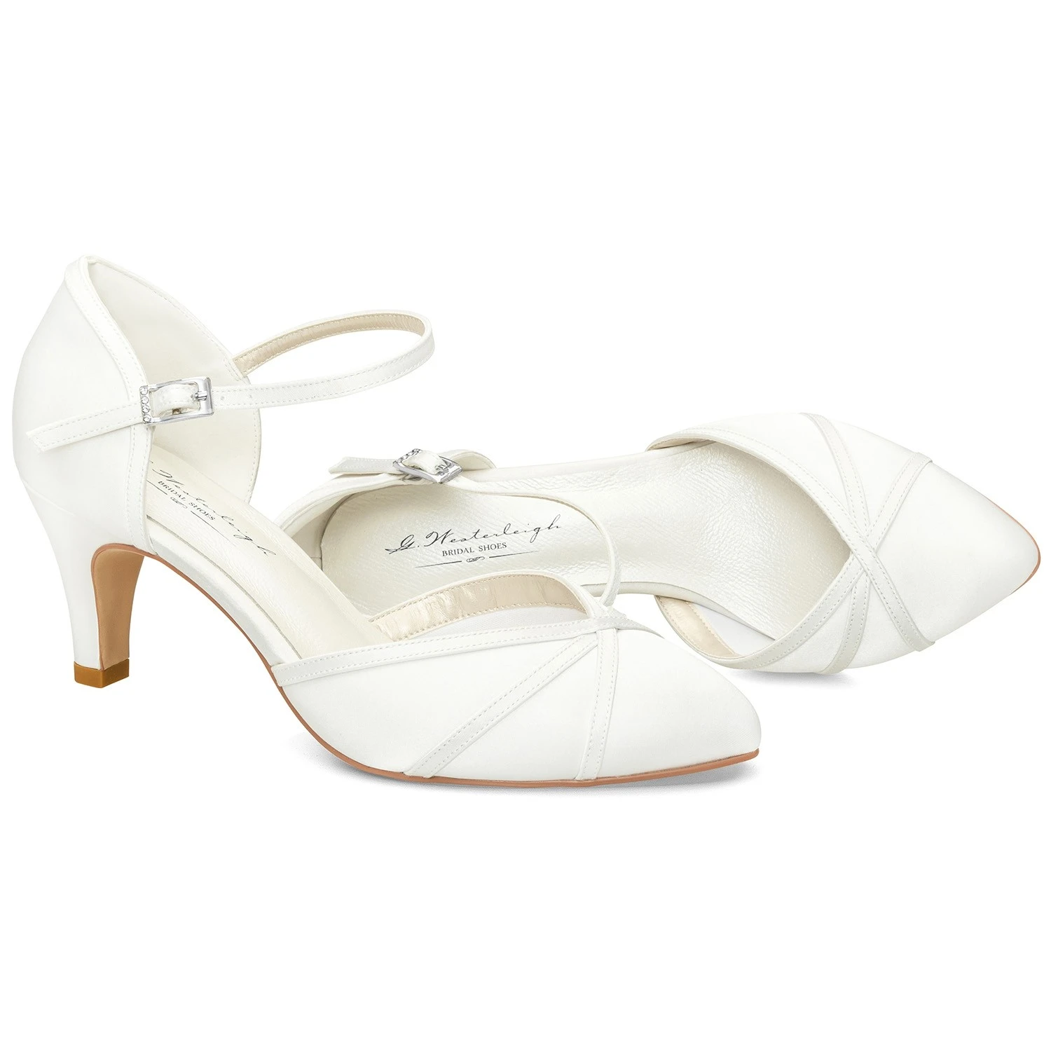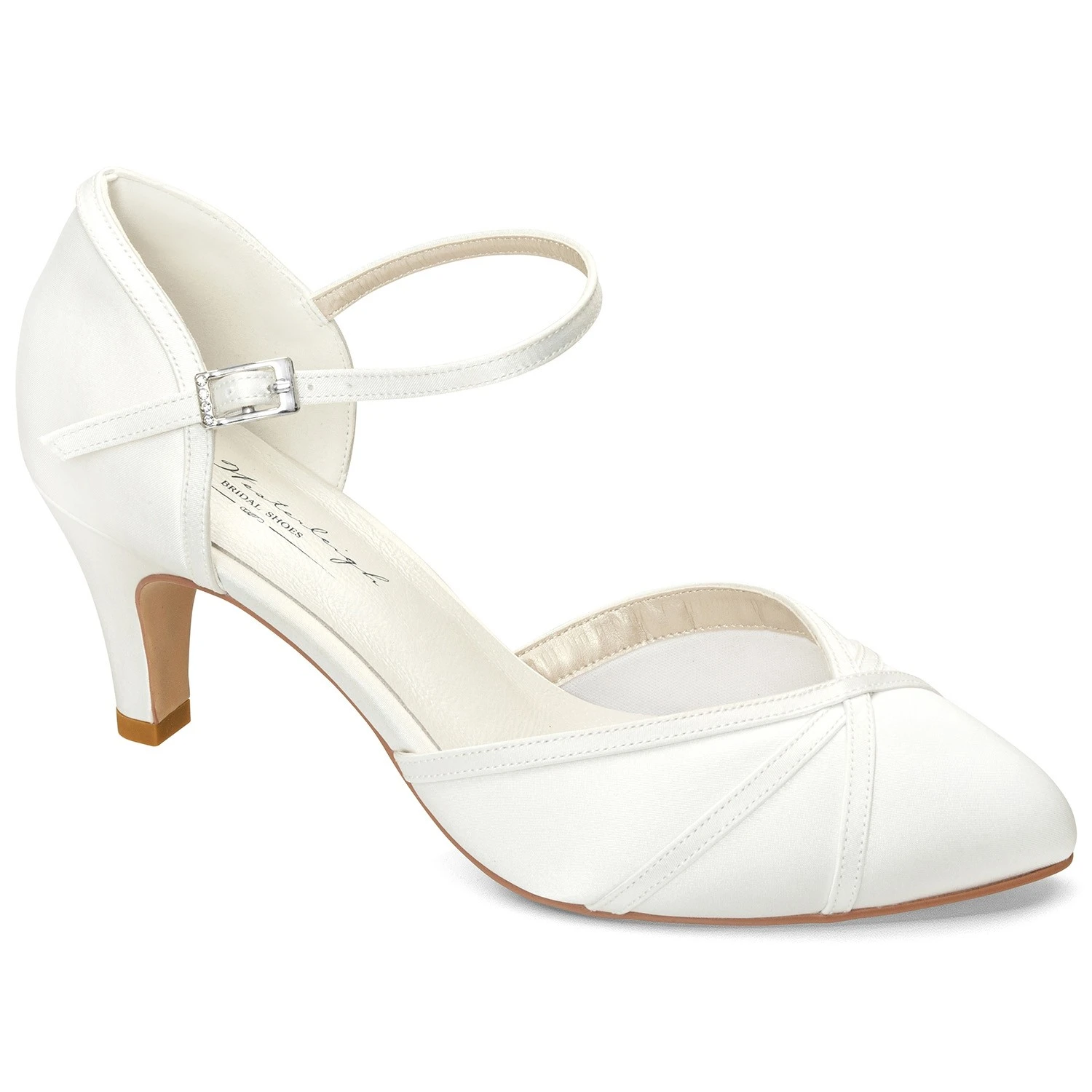 Ces chaussures de mariĂ©e reprĂ©sentent l’Ă©lĂ©gance classique avec le croisĂ© de satin Ă l’avant de la chaussure.