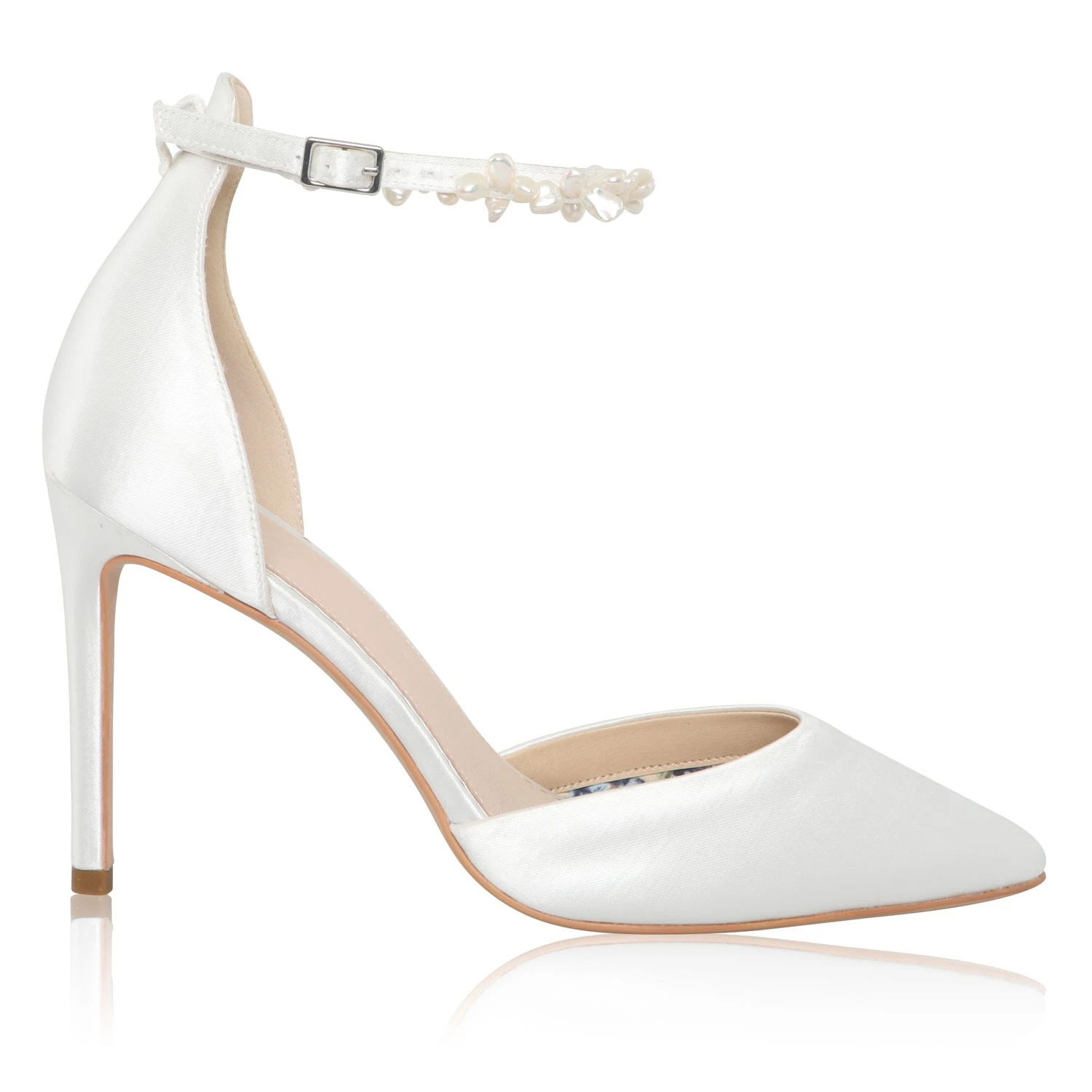 Escarpins de mariage à petit haut et bout pointu, confectionnés en satin ivoire.