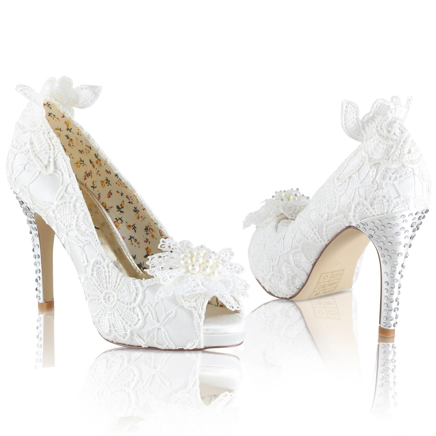 Chaussures de mariée sensationnelles en dentelle ivoire avec semelles compensées.