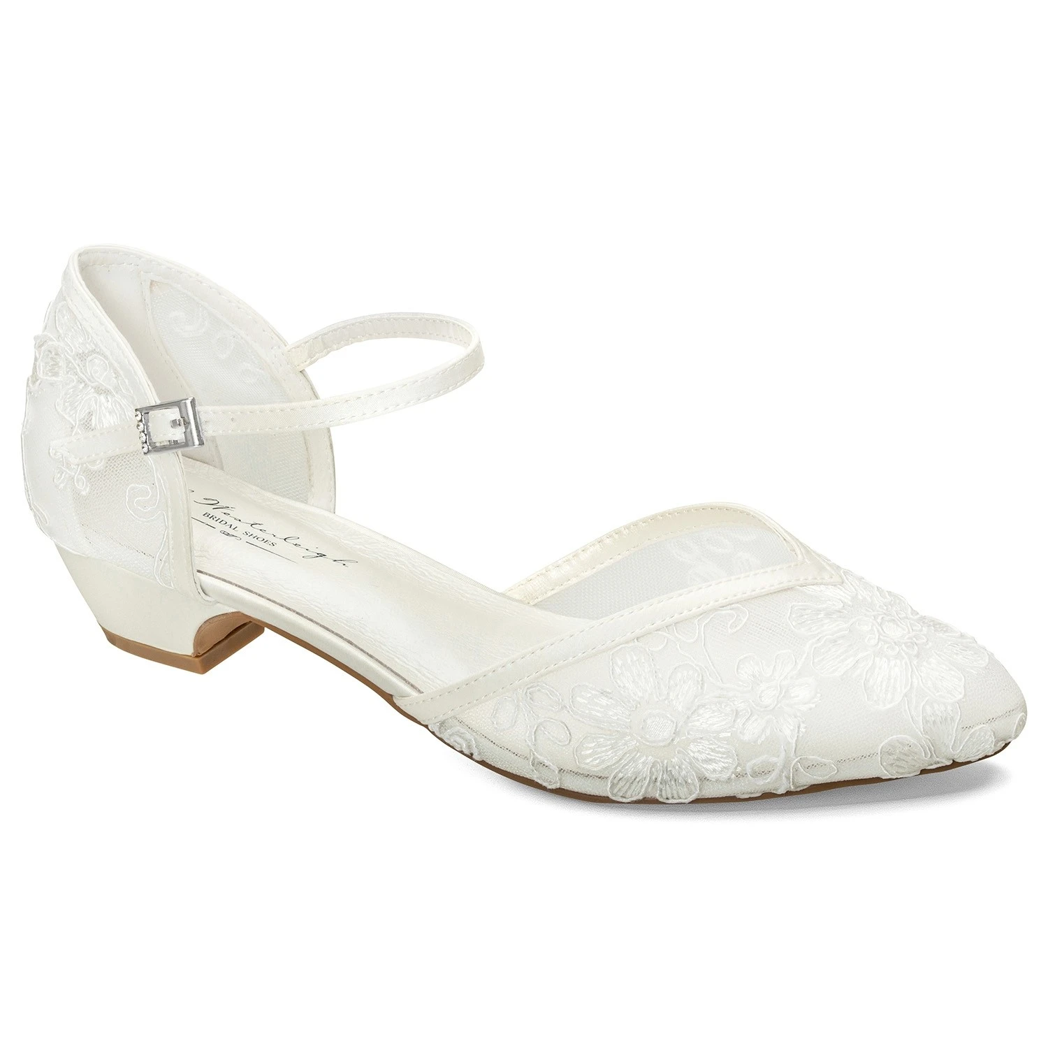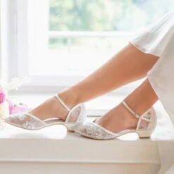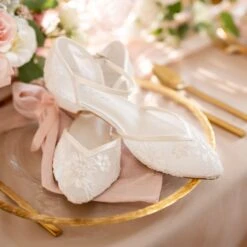 Estella est une chaussure de mariage spĂ©ciale, faite Ă la main, recouverte d’une dentelle translucide.