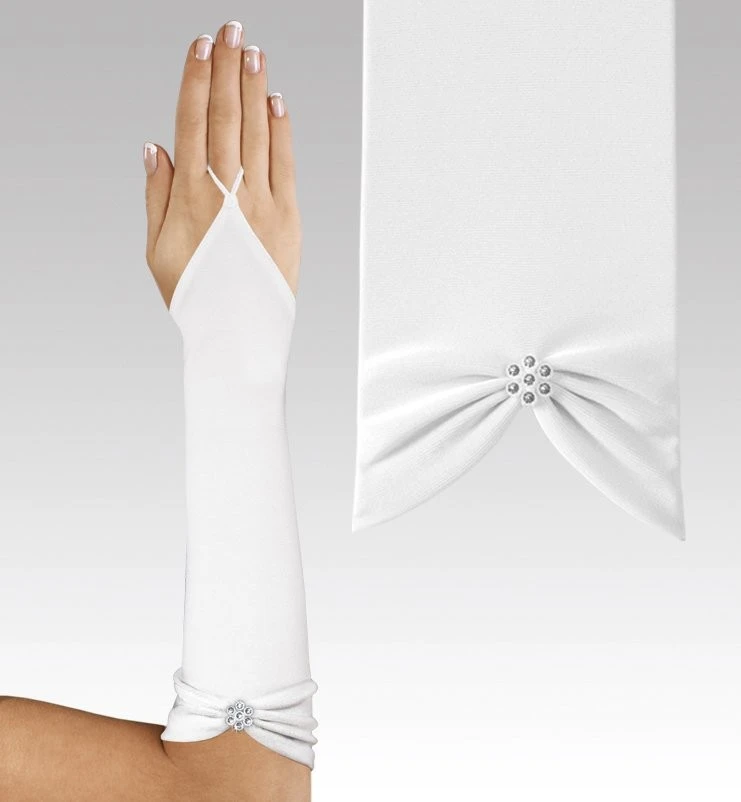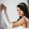Mitaines de mariage en satin mat terminées par un jeu de plissé près du coude avec petites perles de cristal.