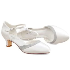 Proposée en satin, la bordure avant de la chaussure est habillée de paillettes argentées. Idéal pour donner un petit peu de peps à une robe de mariée classique !