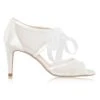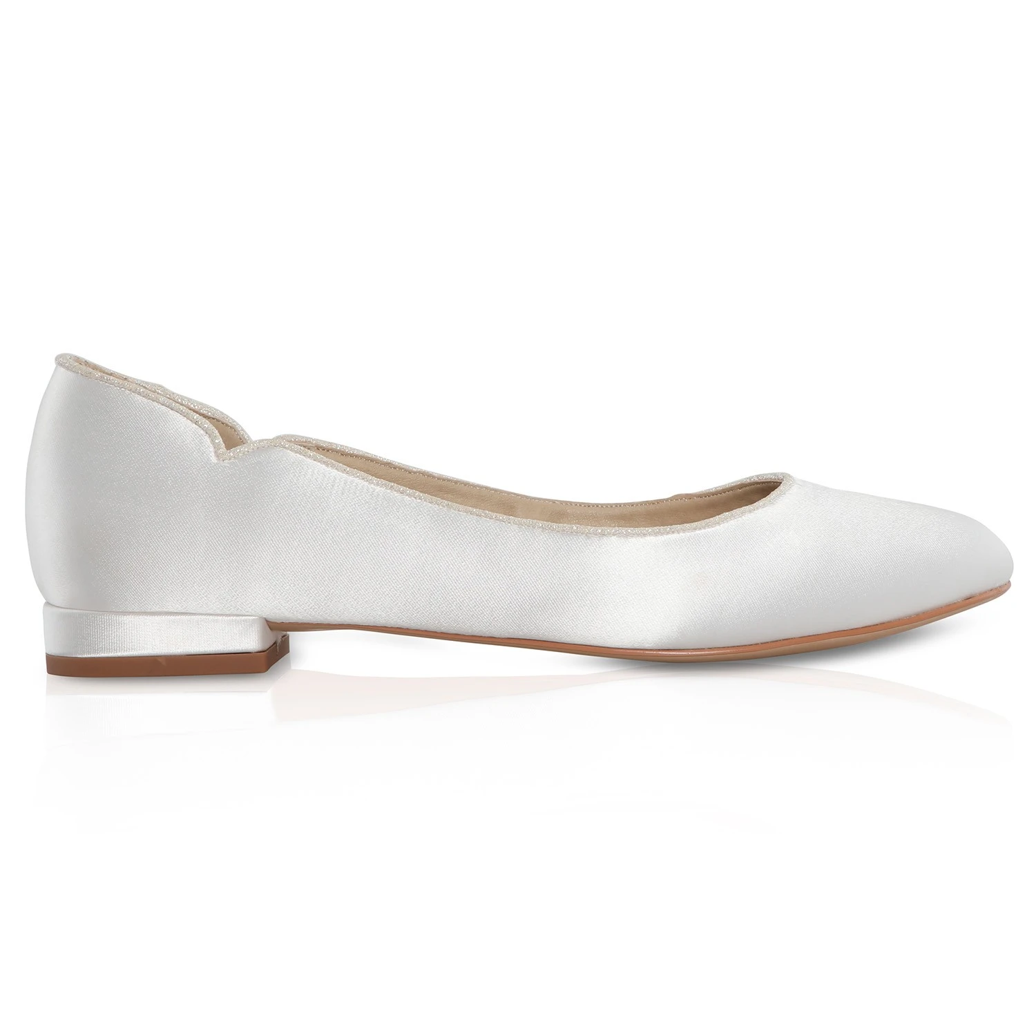 Belles ballerines de mariée fabriquées en satin ivoire et agrémentées d’une une bordure de paillettes dorées.