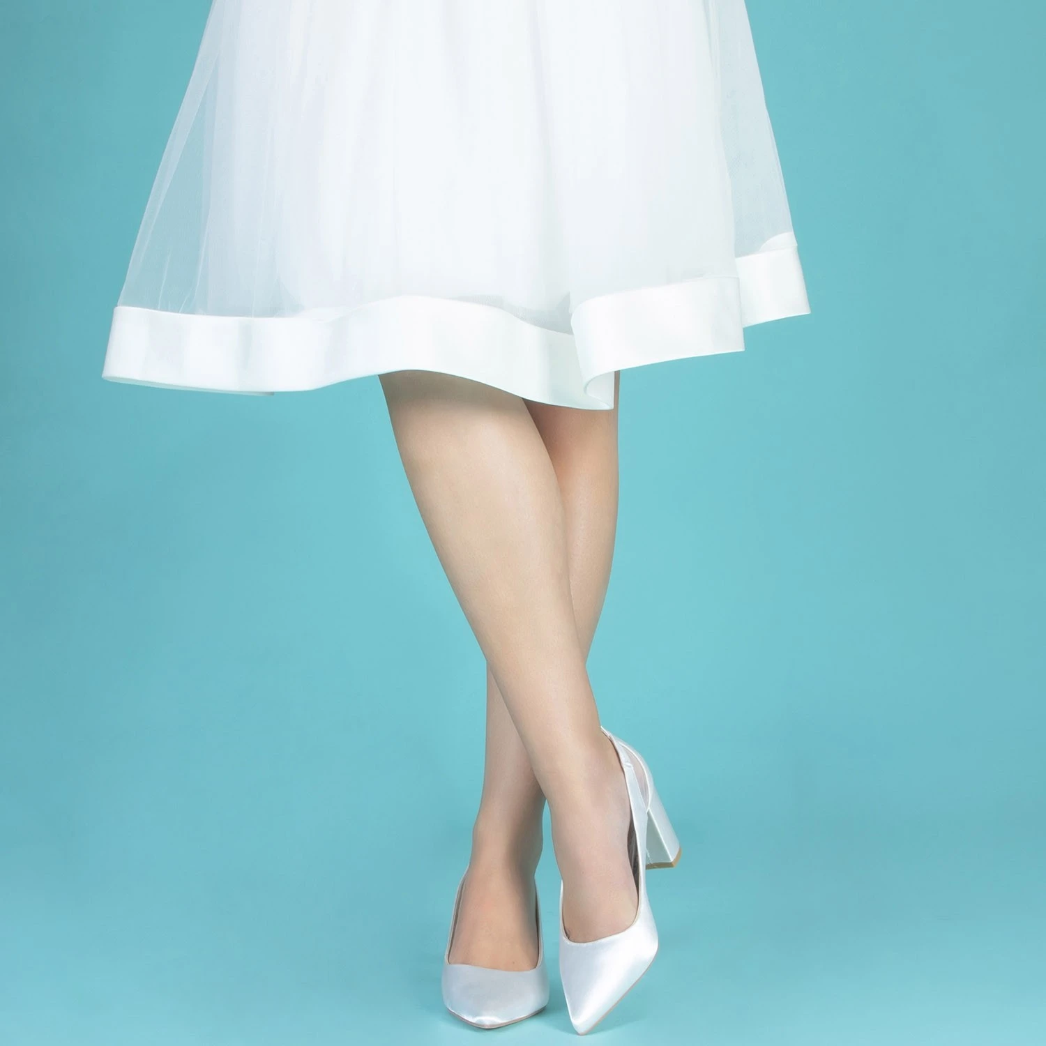 Layla est une chaussure de mariée à talon haut, fabriquée en satin ivoire.