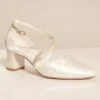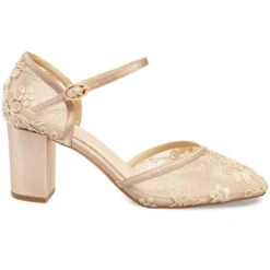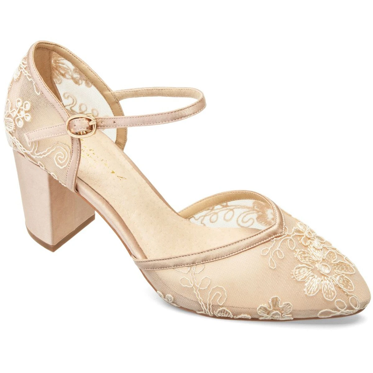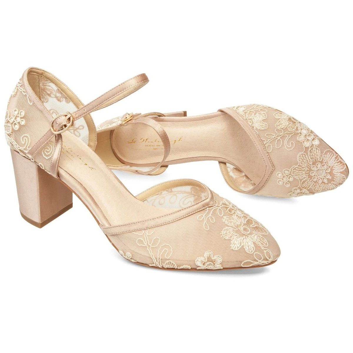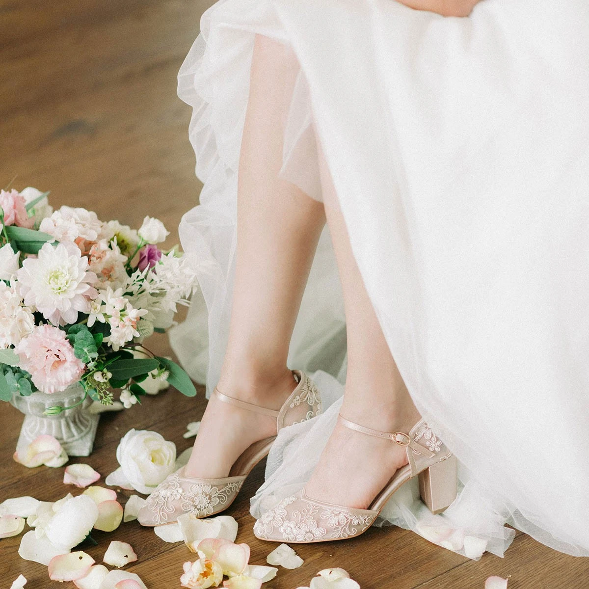 Chaussures de mariée exclusives en dentelle de coloris nude.