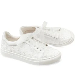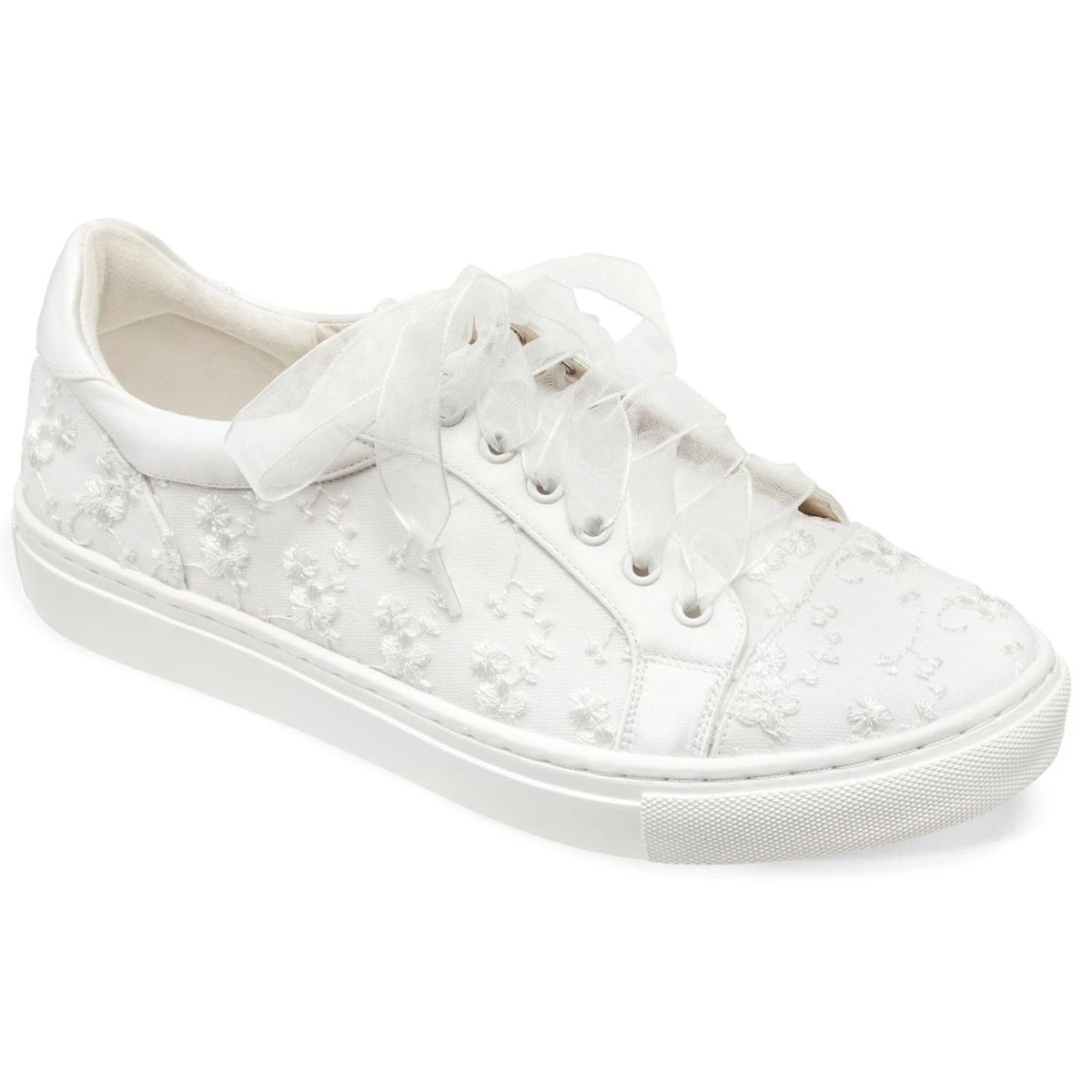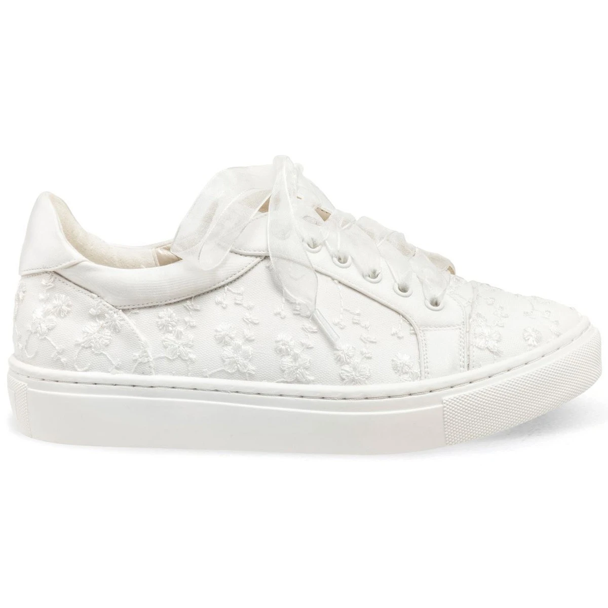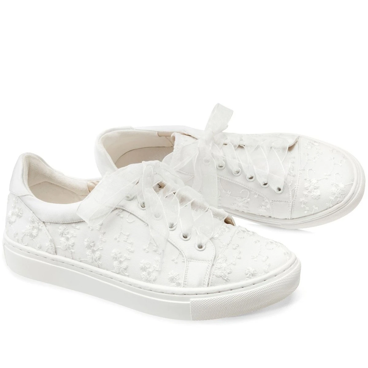 Baskets de mariage ivoire recouvertes d’une dentelle Ă motifs de fleurs romantiques.