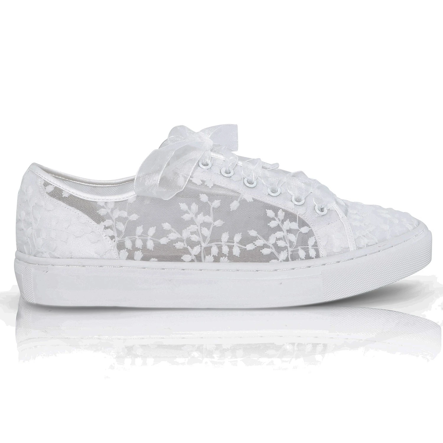 Une dentelle délicate brodée sur un support en maille transparente permet à ces jolies baskets de s’assortir parfaitement à n’importe quelle robe de mariée.