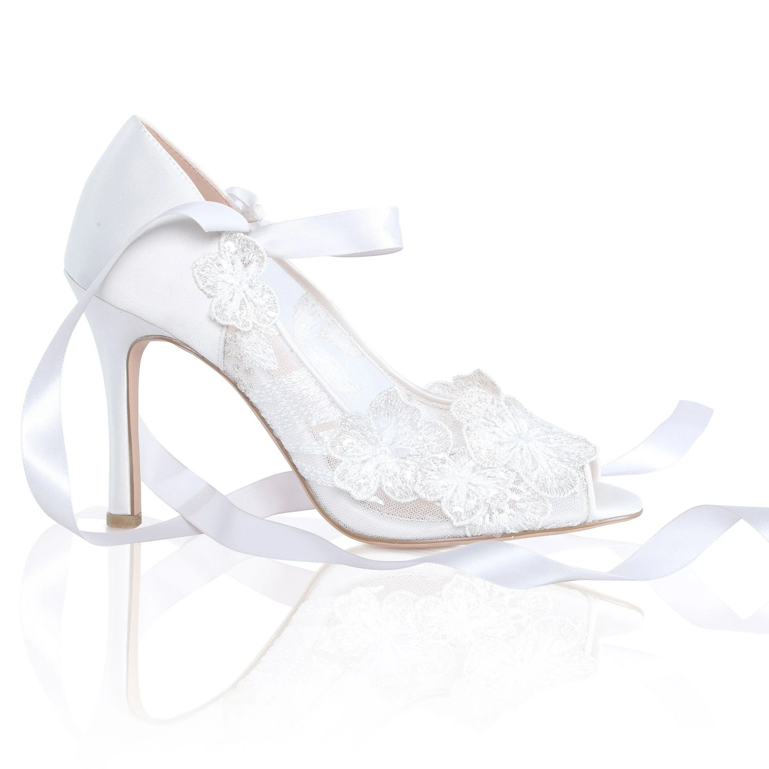 Chaussures de mariage Ă talon haut et bout ouvert, en satin ivoire.