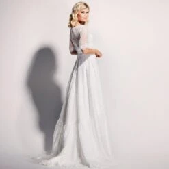 Les manches en dentelle arrivent aux coudes, et le dos de la robe est recouvert de dentelle.