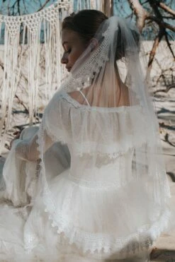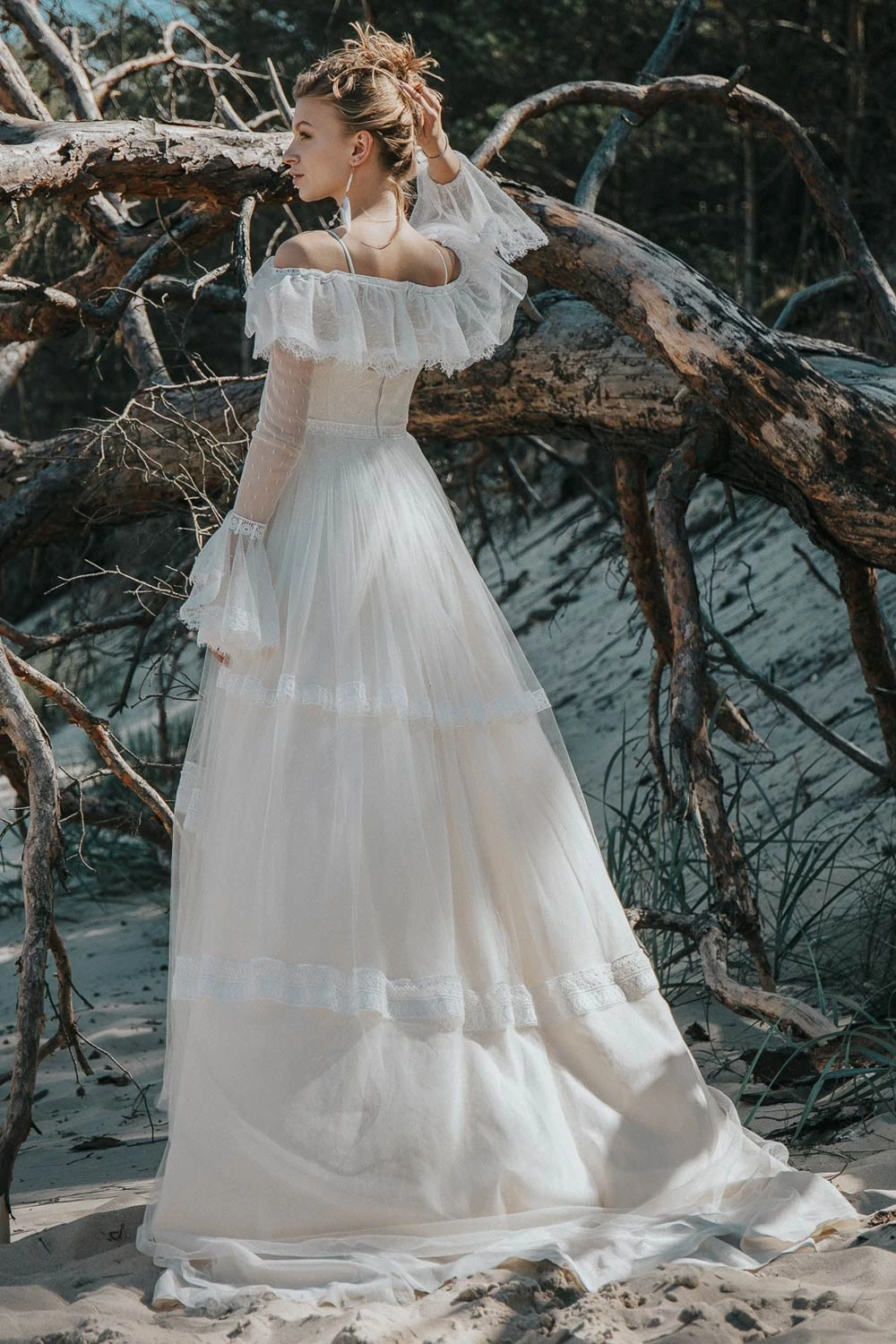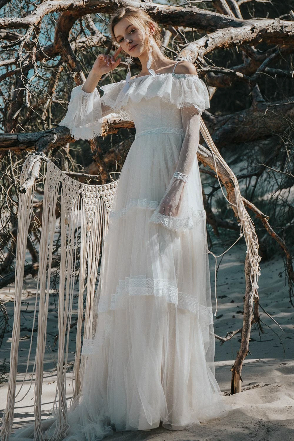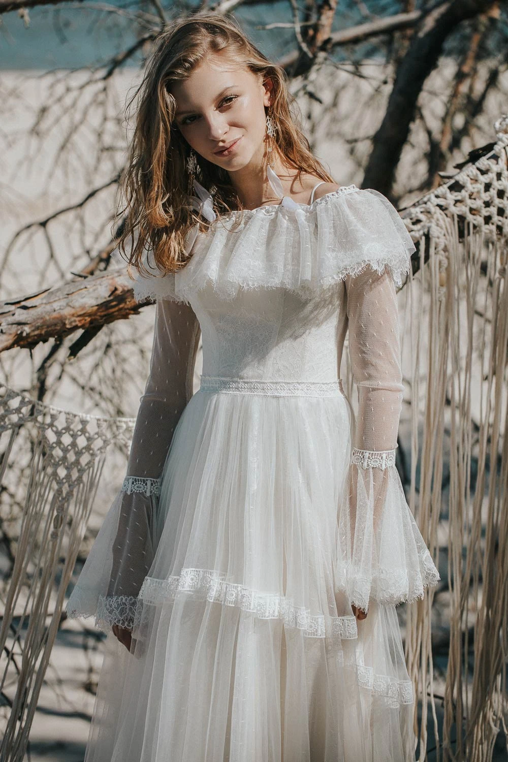 Robe résolument bohème avec ses manches longues, sa dentelle boho et son tulle italien à plumetis (à pois).