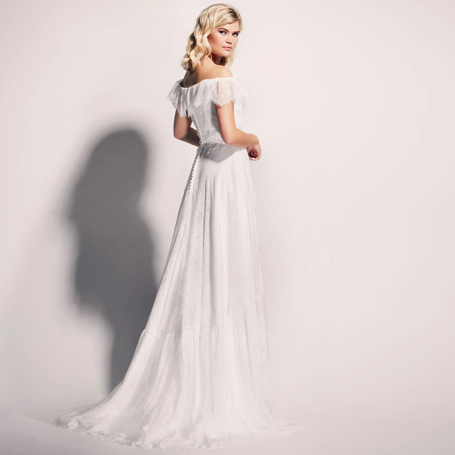 Robe de mariée bohème en dentelle ivoire et à col bateau.