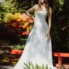 La robe se ferme dans le dos grâce à un laçage permettant d’ajuster parfaitement le bustier.