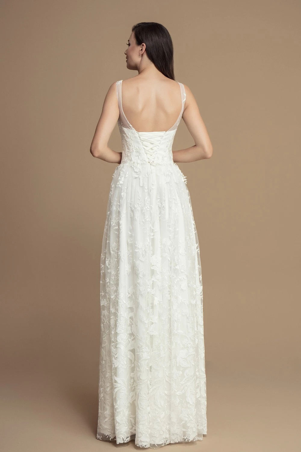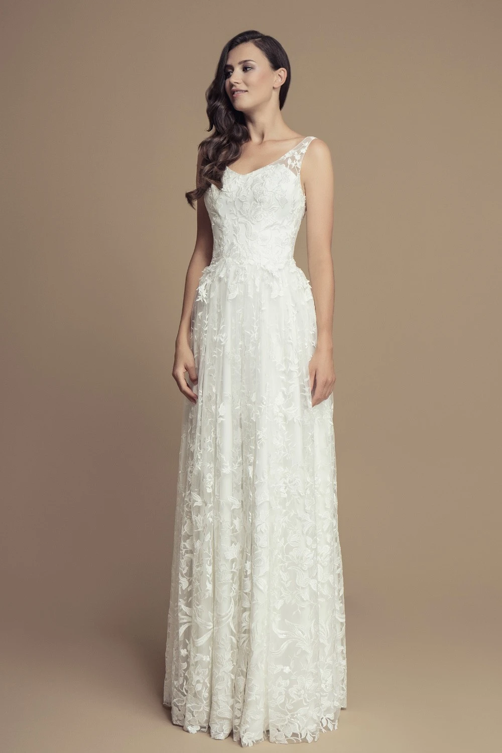 Elégante robe de mariée tout en dentelle, avec fines bretelles laissant un dos dégagé sublime.