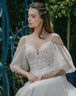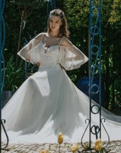 Robe de mariée bohème avec bustier en dentelle rebrodé, manches amovibles et jupe en tulle.
