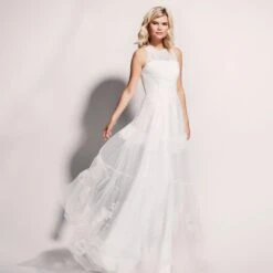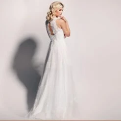 Le dos de la robe s’habille de belles bretelles de dentelle, laissant le coeur du dos de la robe ouvert.