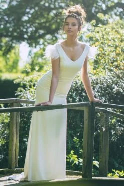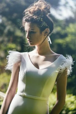 Proposée en mousseline légère, des plumes au niveau des épaules donnent à la robe toute son originalité.
