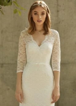 Robe de mariée courte élégante en dentelle à encolure en V et manches 3/4.