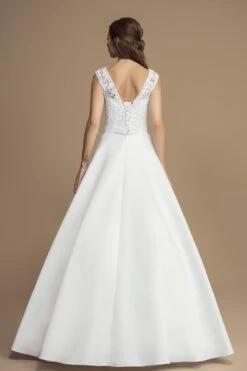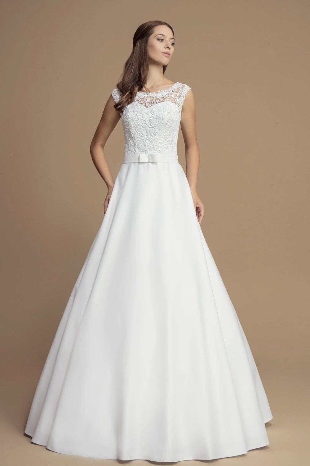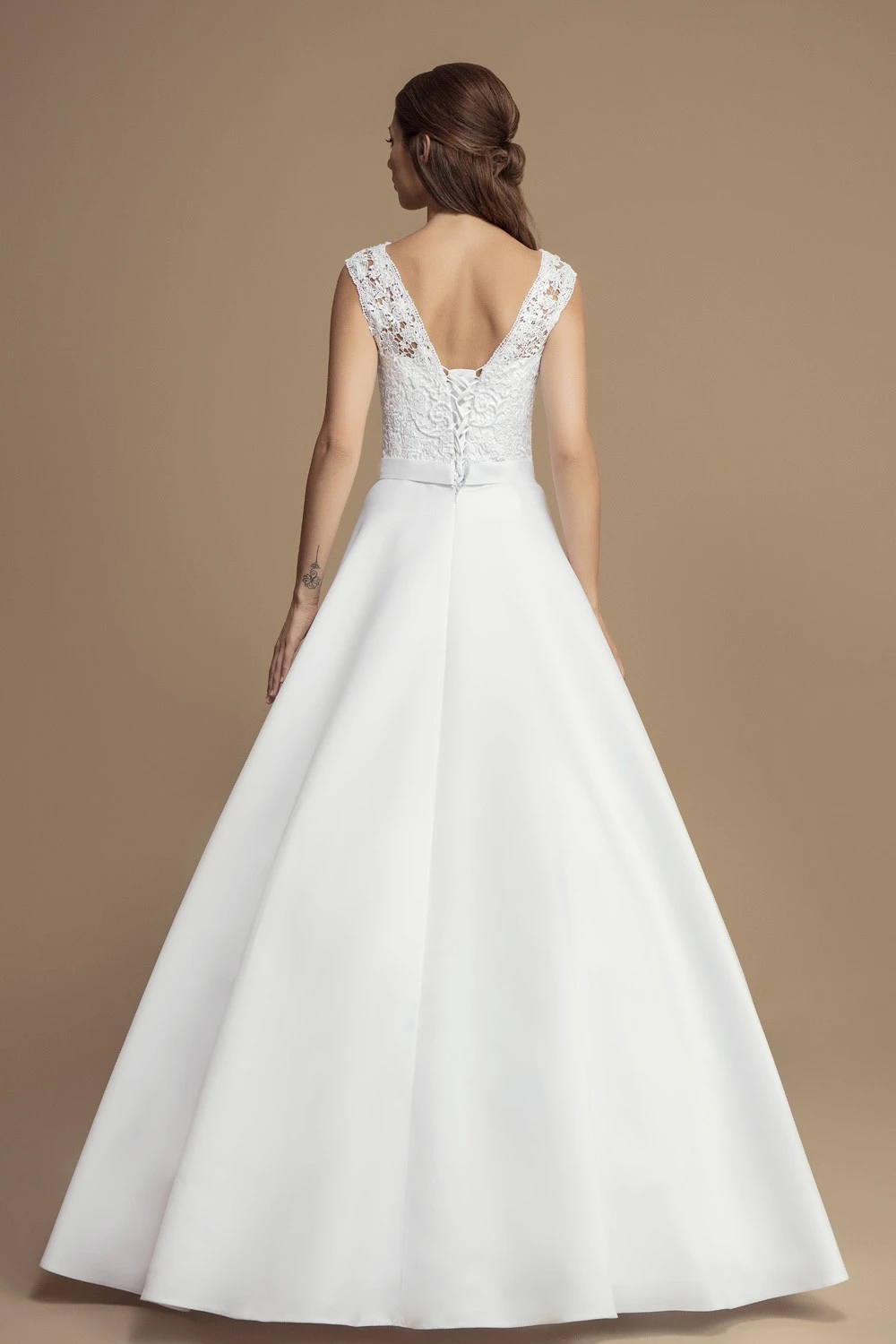 Robe de mariée princesse avec bustier en guipure et jupe en satin.