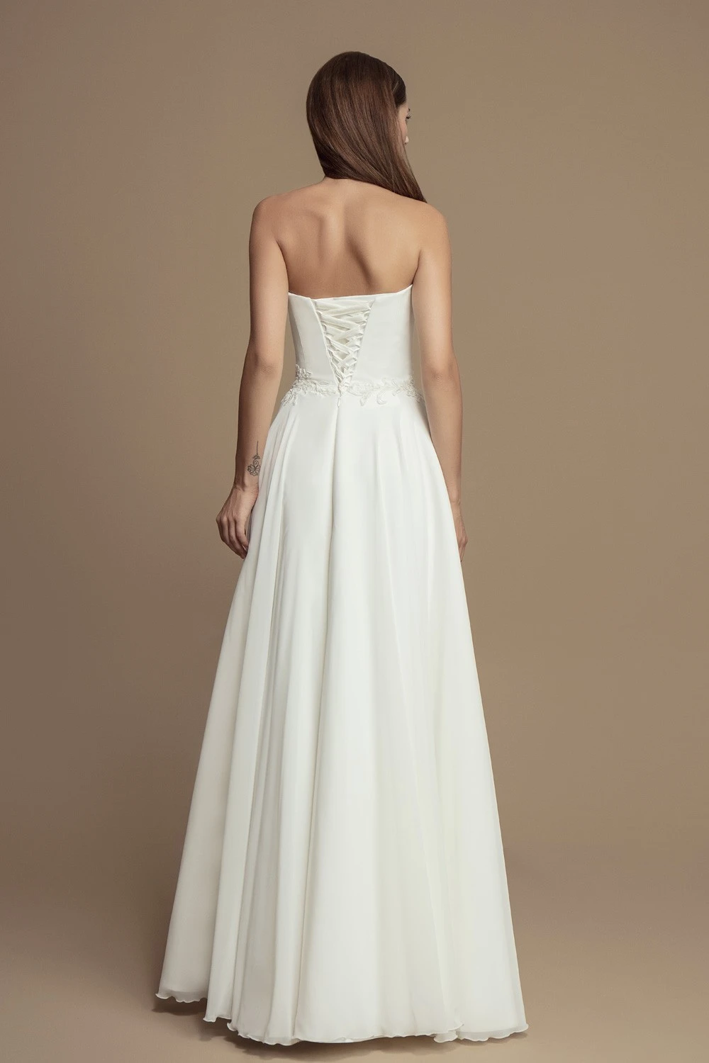 La robe se ferme dans le dos grâce à un laçage permettant d’ajuster parfaitement le bustier.