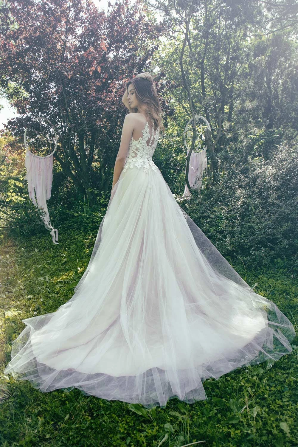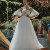 Robe de mariée princesse tout en romantisme avec son décolleté illusion et son tulle pailleté.
