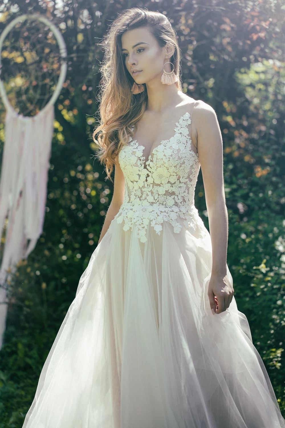Présentée en photo avec bustier nude recouvert de dentelle ivoire et jupe nude recouverte de tulle ivoire.