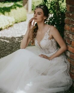 Présentée en photo avec bustier nude recouvert de dentelle ivoire et jupe nude recouverte de tulle ivoire pailleté.