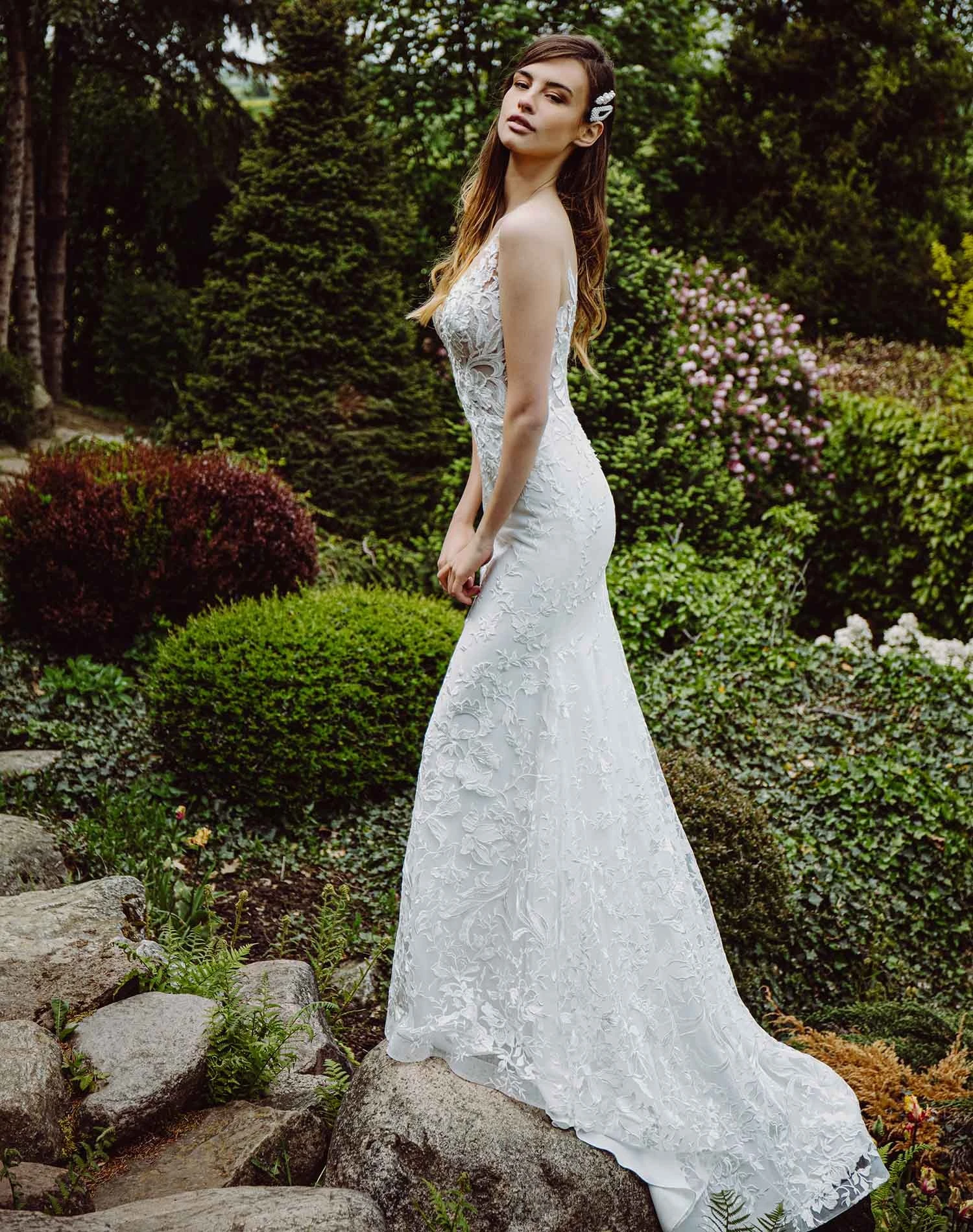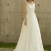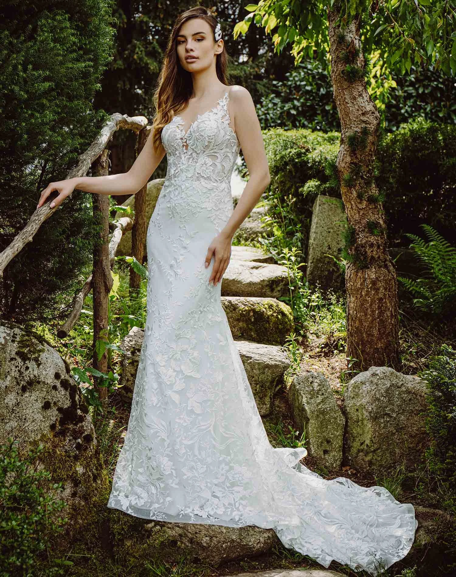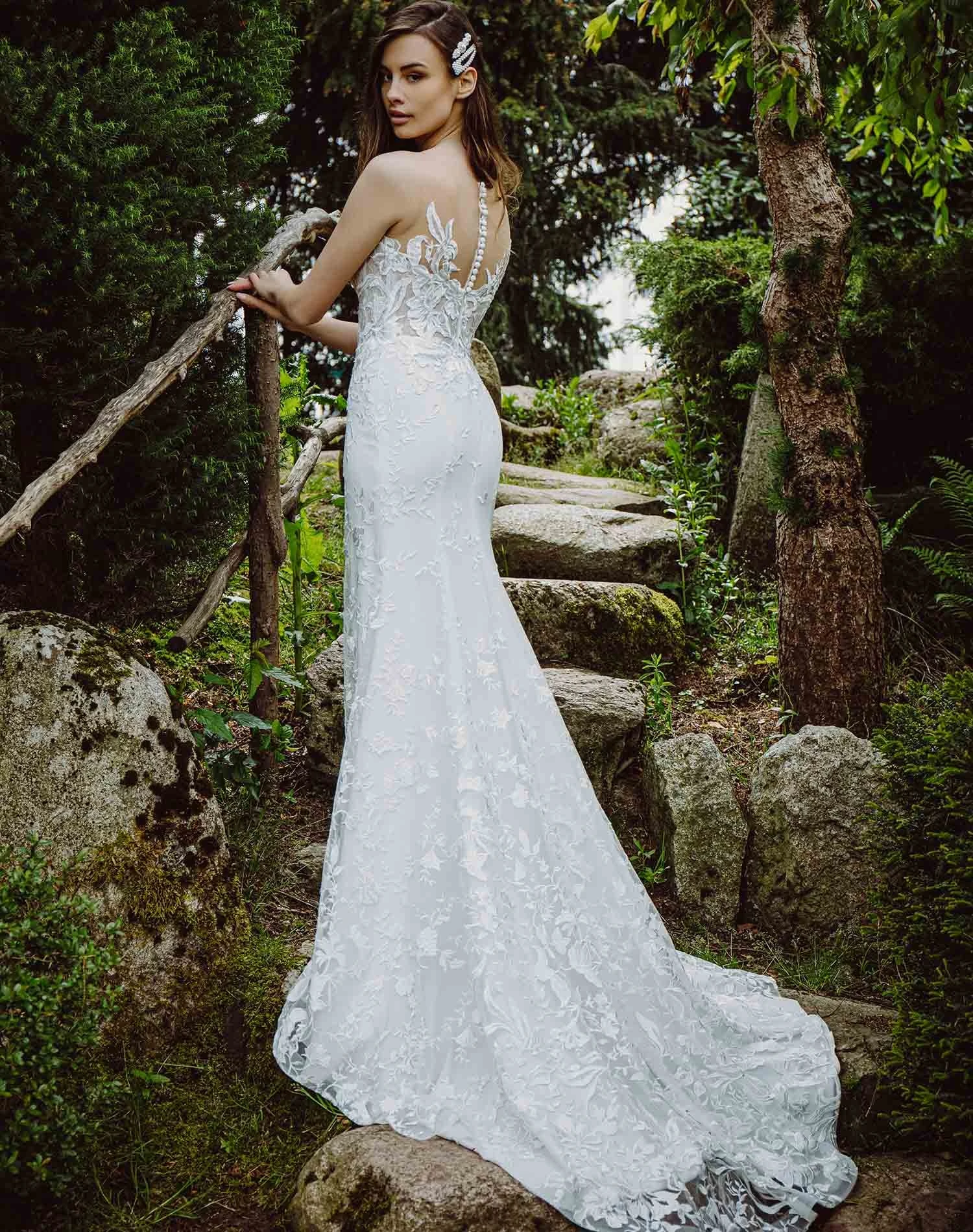 Robe de mariée sirène à décolleté illusion.