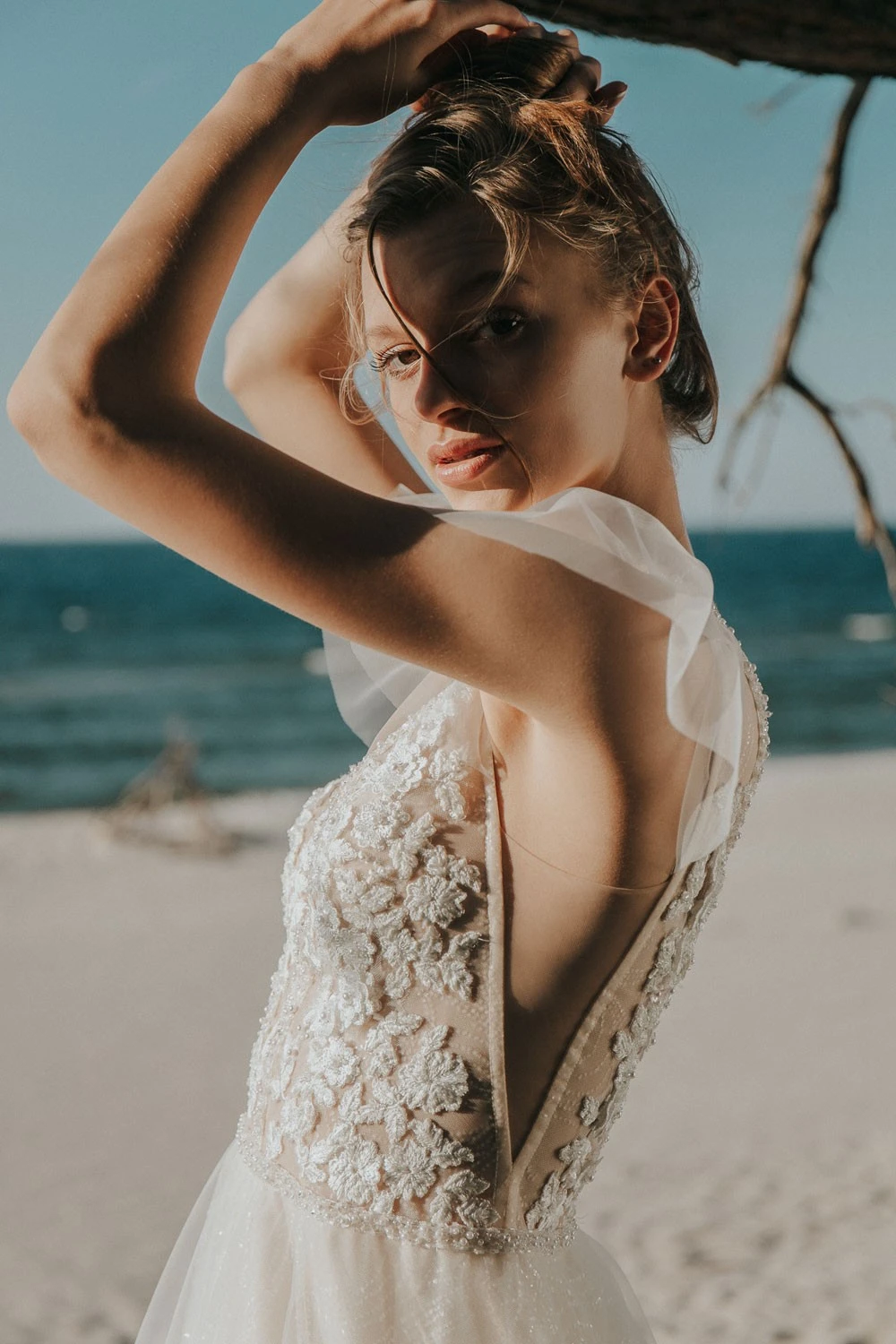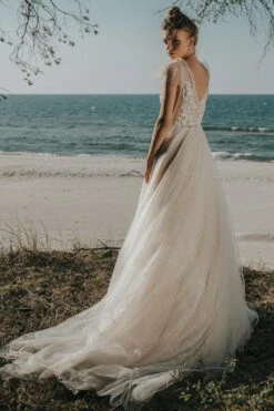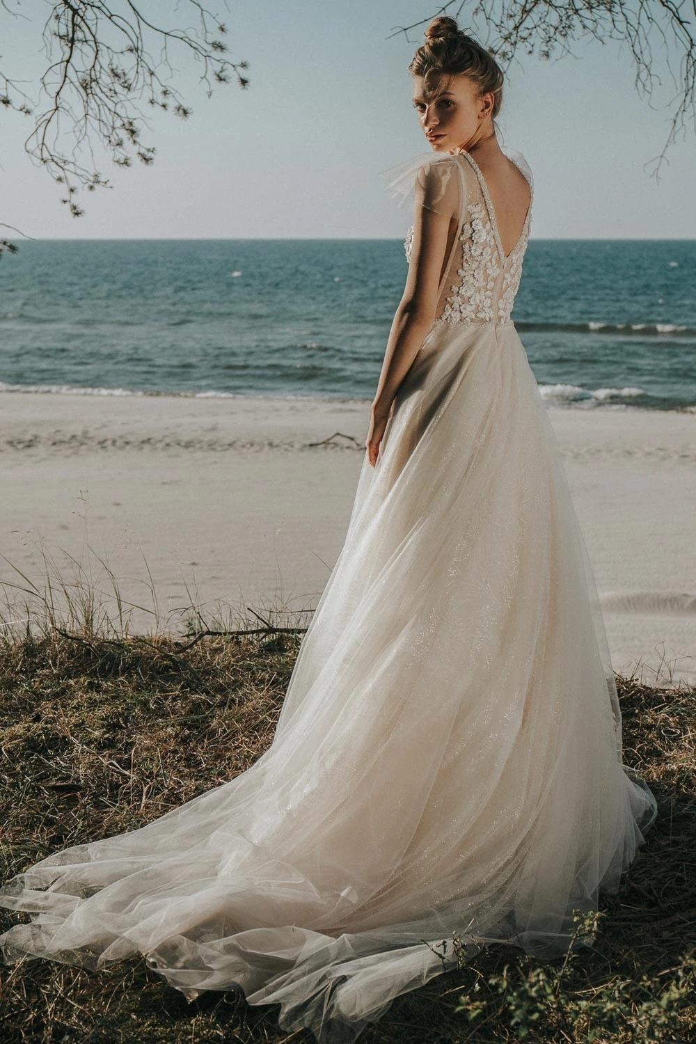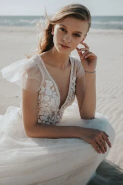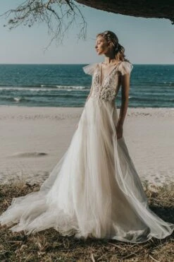 Robe de mariage bohème romantique avec decolleté en V paré de dentelle brodée de cristal et d’un jupe en tulle pailleté.