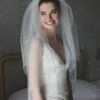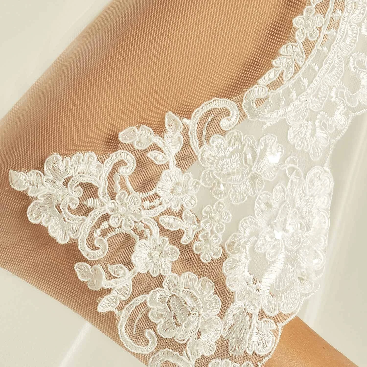 Proposé sans bordure sur sa partie supérieure, le voile dispose d’une jolie bordure en dentelle perlée sur sa partie inféreure.