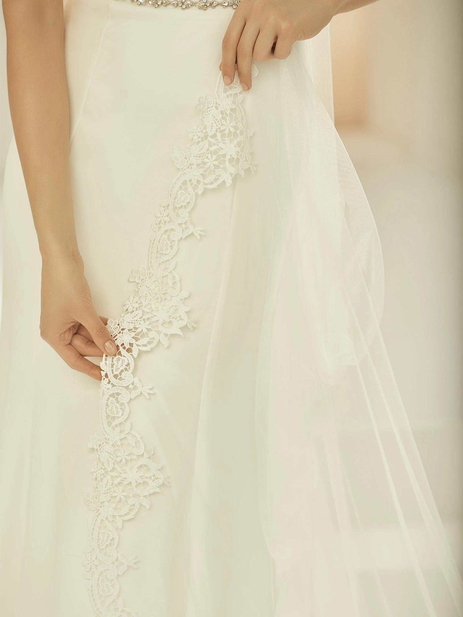 Voile de mariage très long en tulle ivoire bordé de dentelle sur sa partie inférieure.