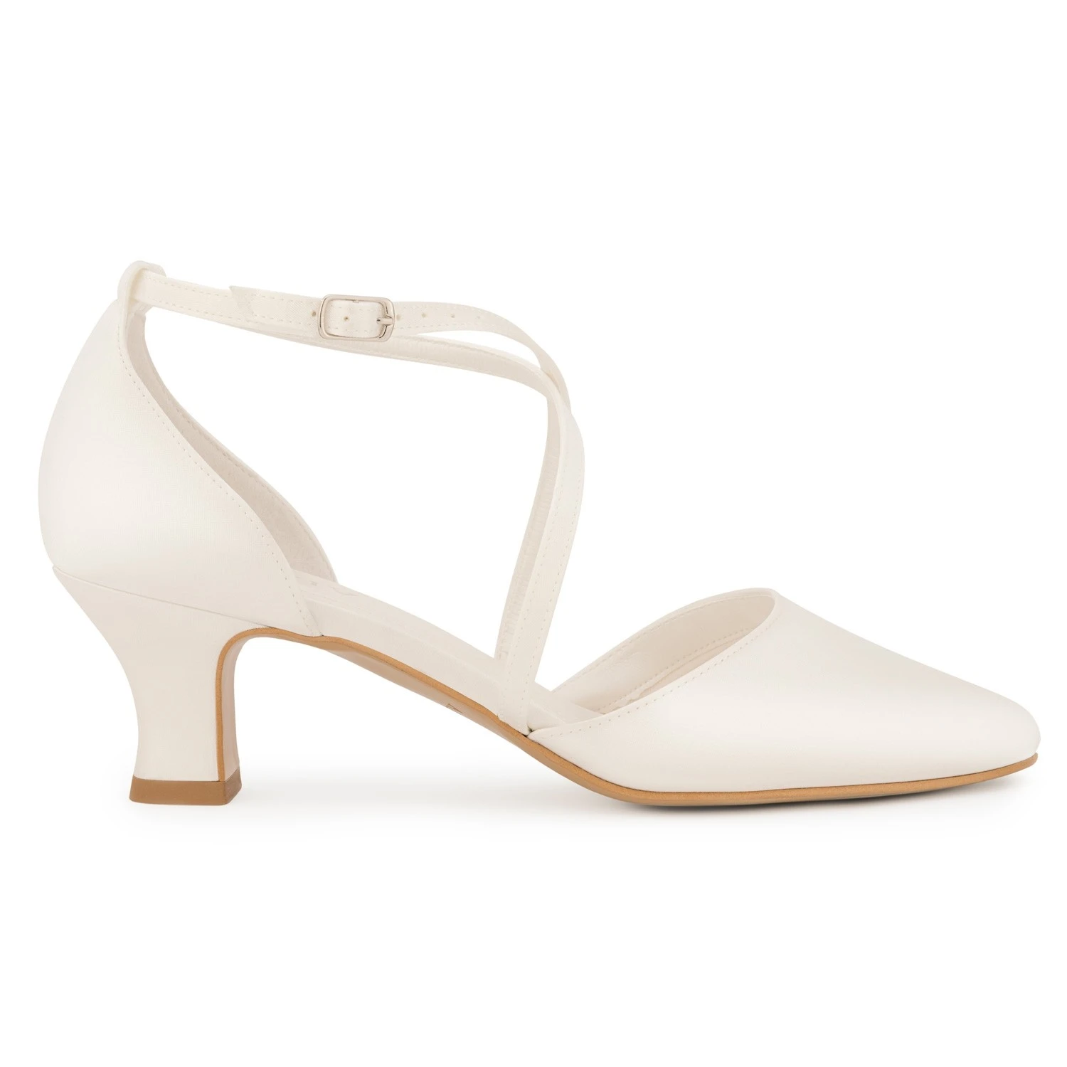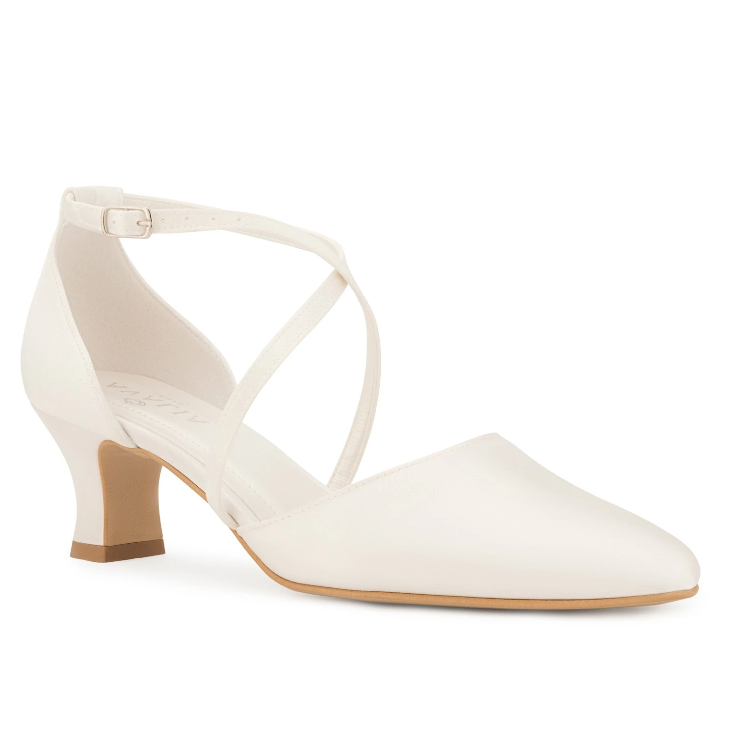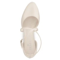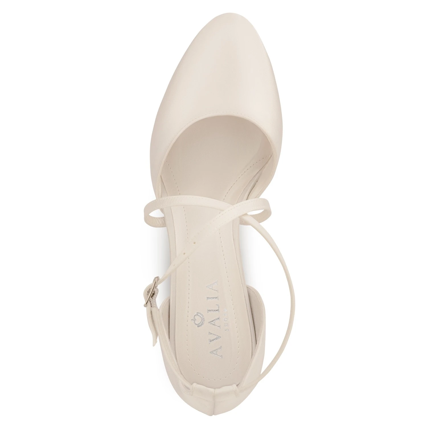 Proposée en satin ivoire, son talon moyen lui procure un excellent confort.