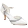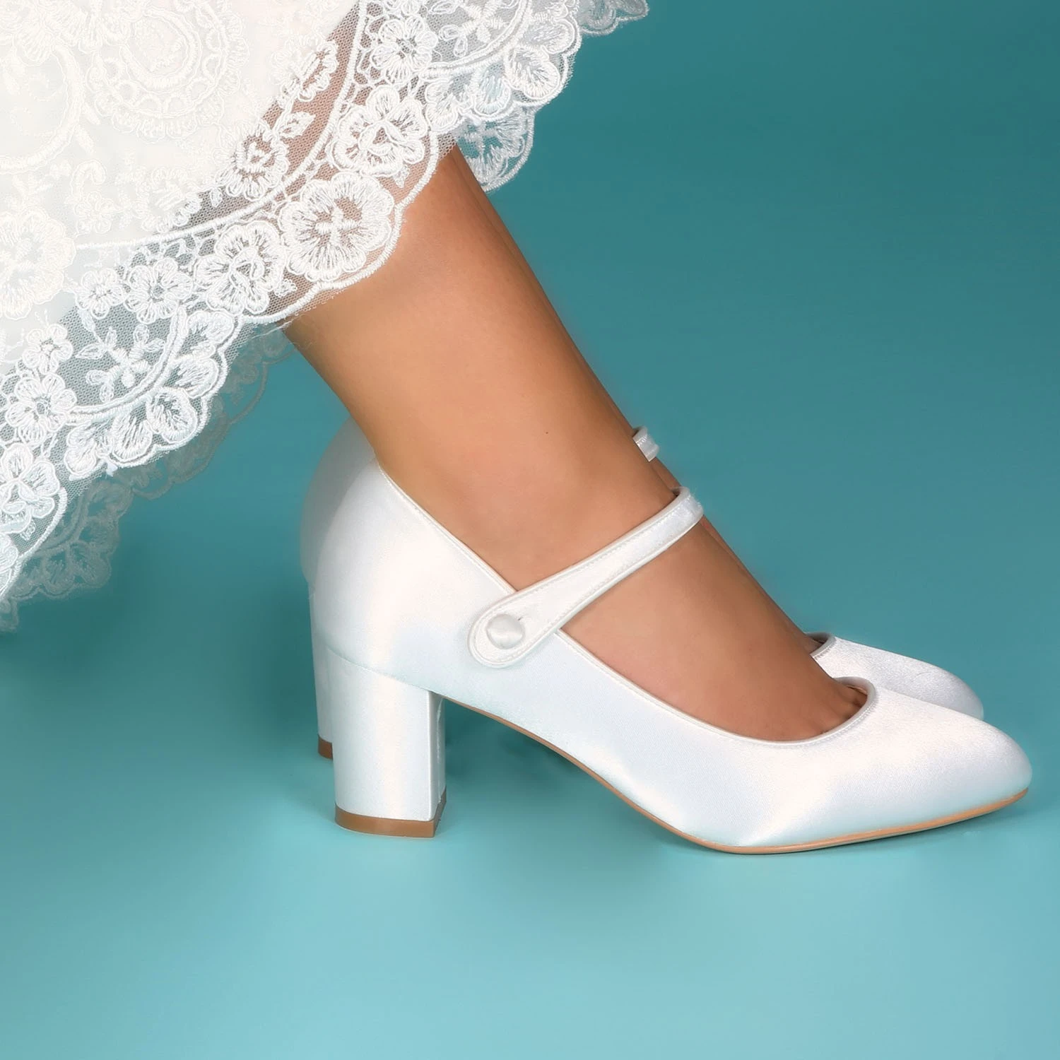 Une magnifique chaussure de mariée Mary Jane de style rétro en satin ivoire avec un bout fermé, une délicate bride à la cheville et un gros talon de 6 cm pour plus de stabilité.