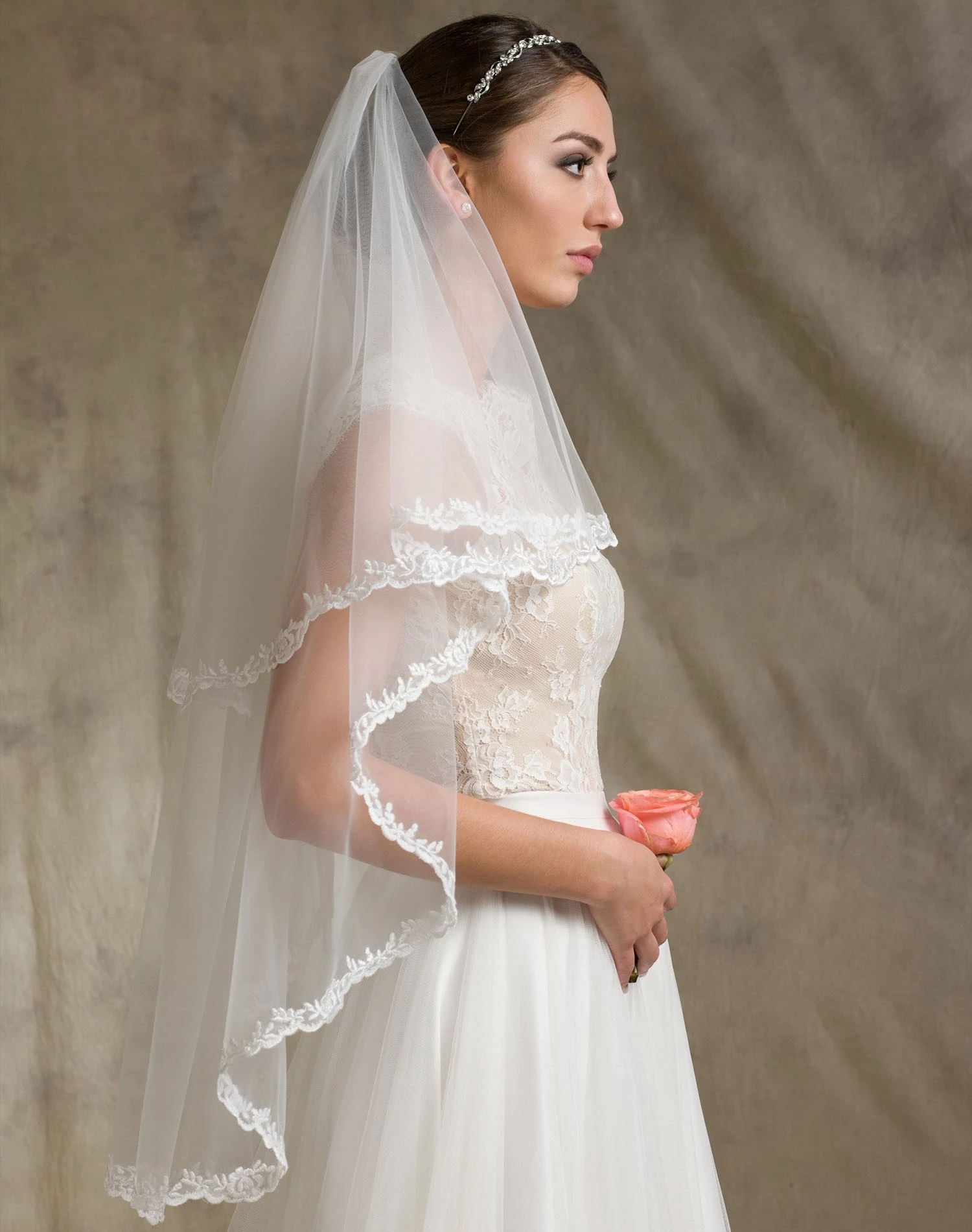 Voile de mariée mi-long en tulle bordé d’une fine dentelle.