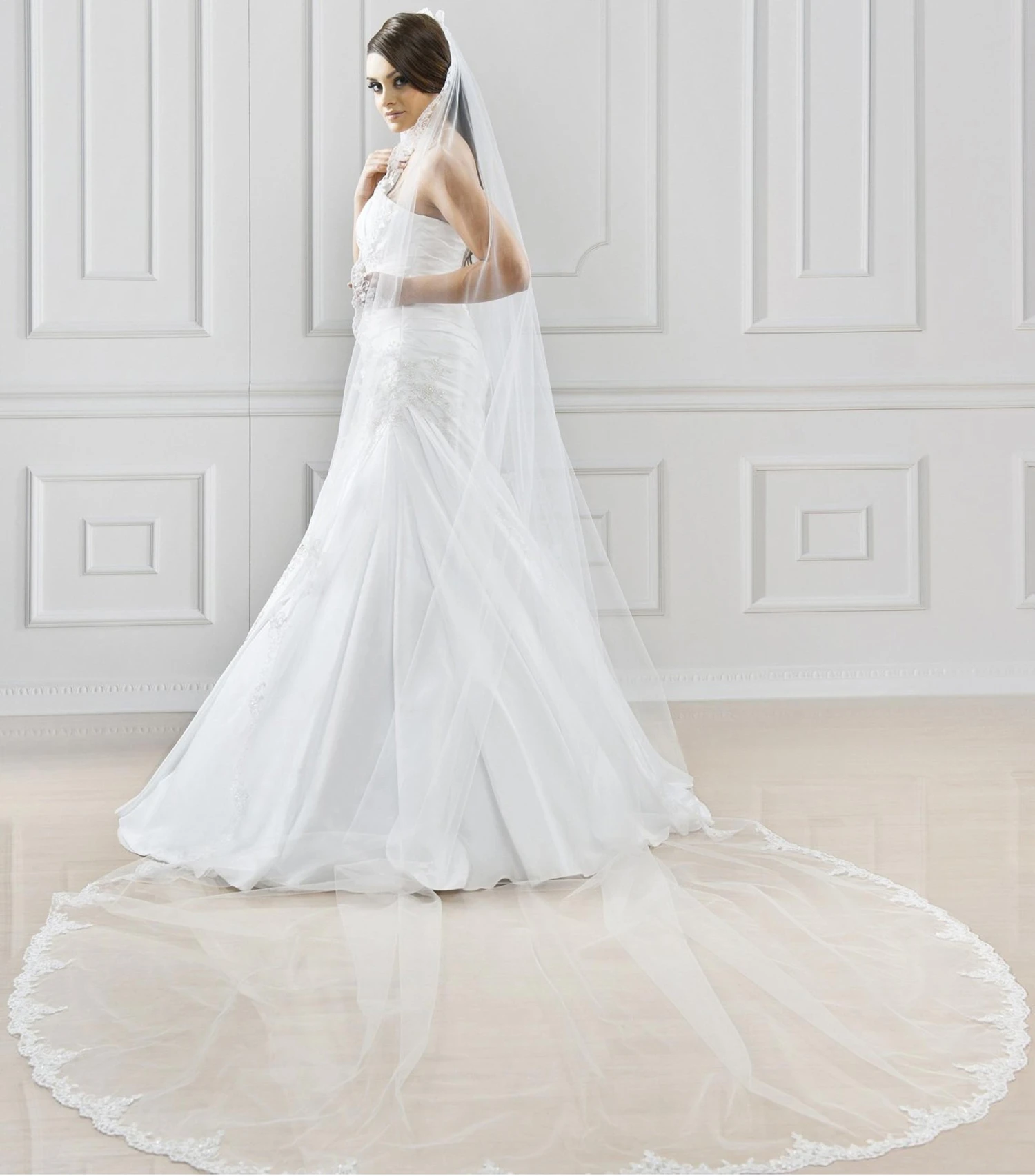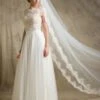 Voile de mariée ivoire très long en tulle classique et dentelle.