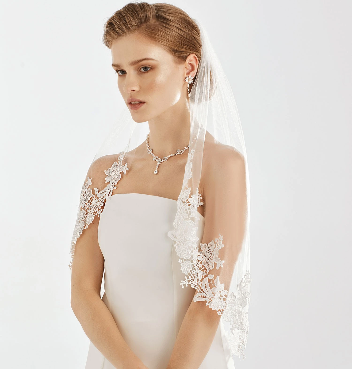 Voile de mariée mi-long en dentelle ivoire.