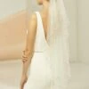 Voile de mariée long en tulle ivoire habillé d’appliques de dentelle.