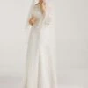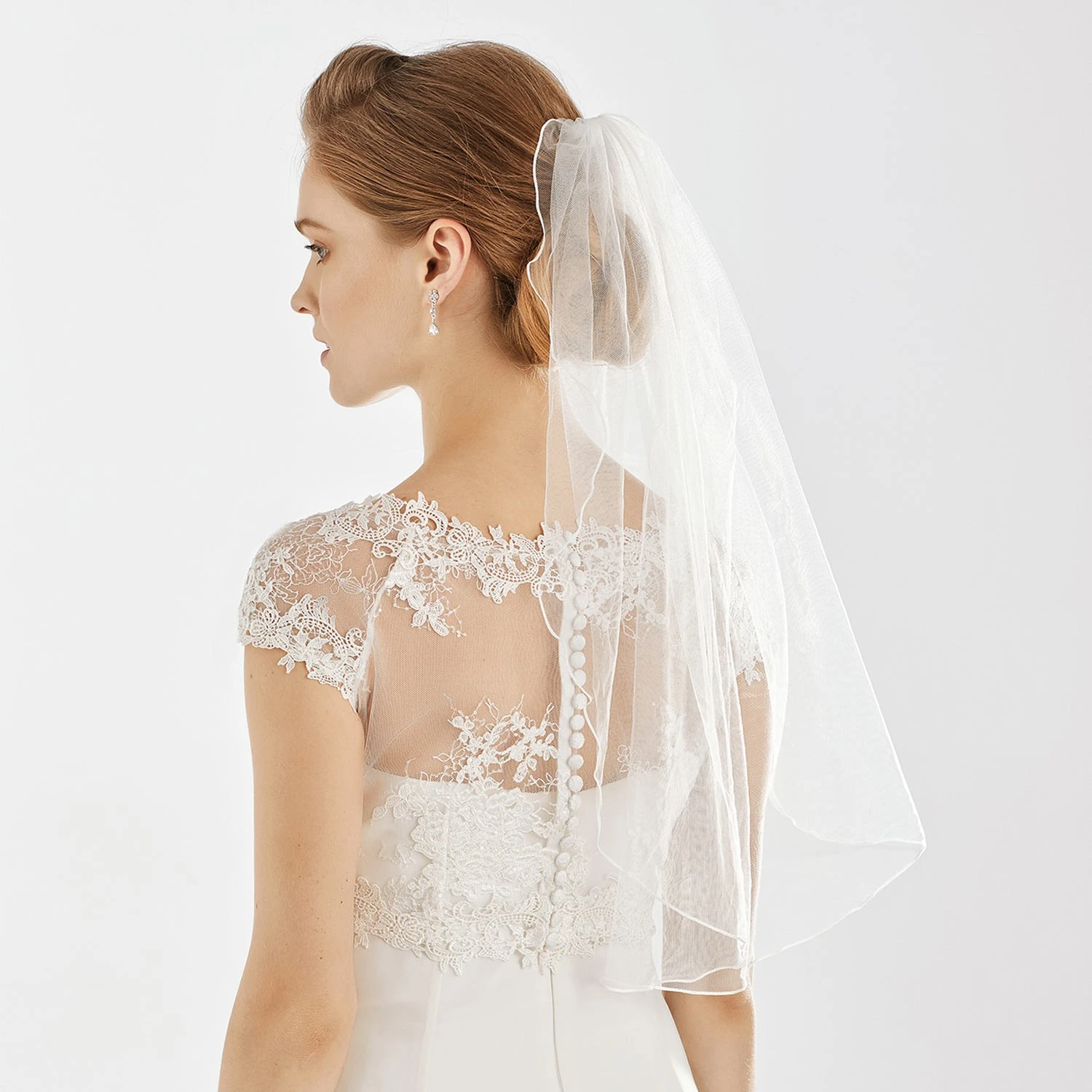 Voile de mariée mi-long en tulle ivoire à bordure festonnée.